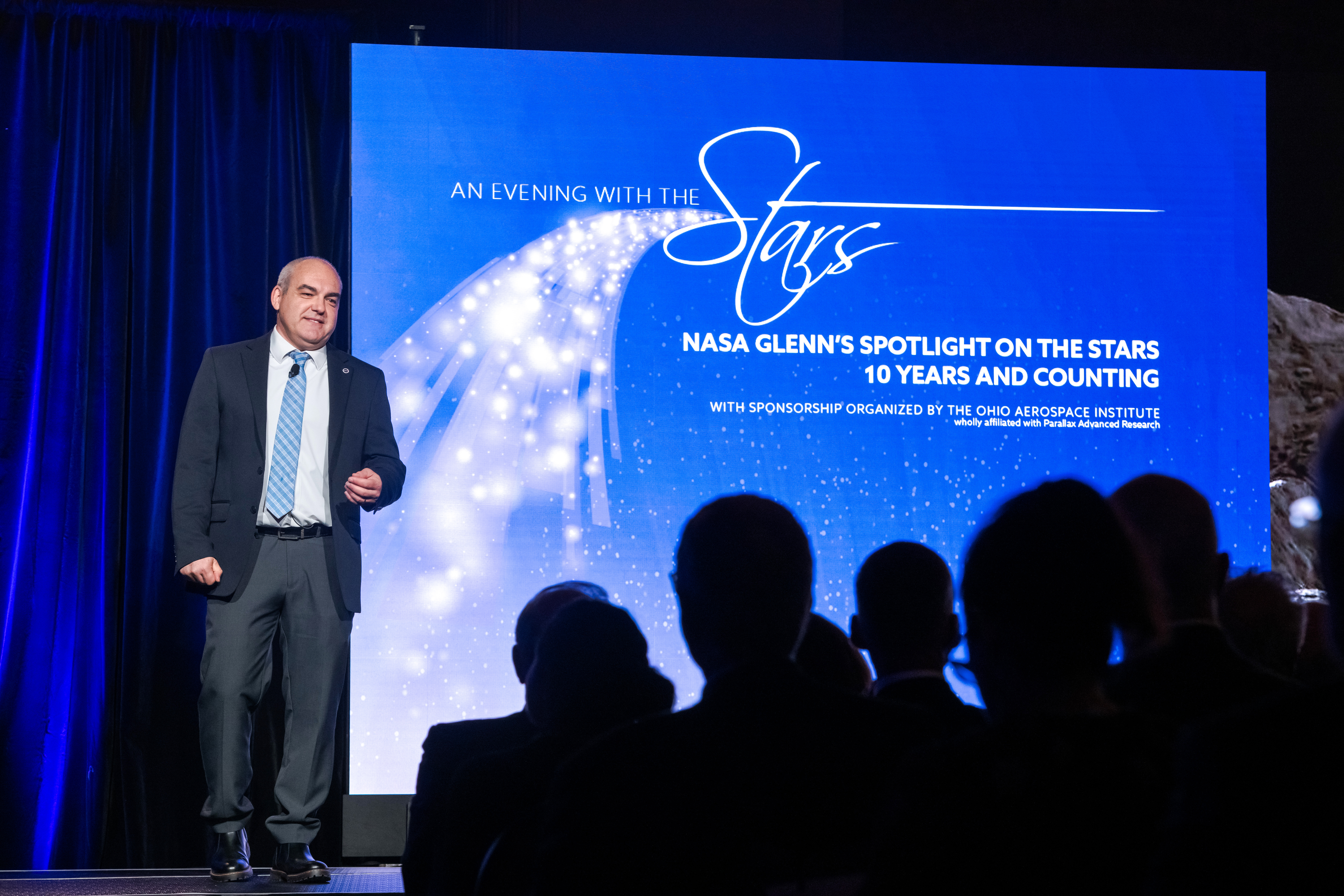 NASA Glenn's Spotlight on the Stars, 10 Years and Counting was held at Windows on the River in Cleveland, OH on November 20th, 2024. Sponsorship organized by the Ohio Aerospace Institute. Welcome by Dennis Andersh, CEO and President, Parallax Advanced Research, Ohio Aerospace Institute. Remarks by Terrence Slaybaugh, Vice President of Sites and Infrastructure, JobsOhio. Introduction of 10th Anniversary Video, Dr. Wanda Peters, Acting Deputy Director, NASA Glenn Research Center. Remarks/Introduction of Presenters, Dr. James Kenyon, Director, NASA Glenn Research Center. Keynote Speakers: Nikki Welch, NASA Glenn Communications, Connecting People to the Mission. Timothy Smith, NASA Glenn's Superalloy Achievements. Carlos Garcia-Galan, Dreaming of Going to the Moon.