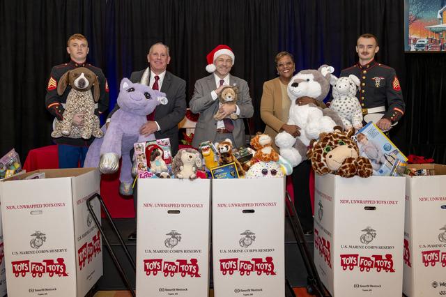 The US Marine Corps Reserve Collected Toy Donations for the 2024 Holiday Season. Members of the Marine Corps, Associate Director Laurence Sivic, Center Director Dr. James Kenyon and Acting Deputy Center Director Dr. Wanda Peters pose with the toy donations.