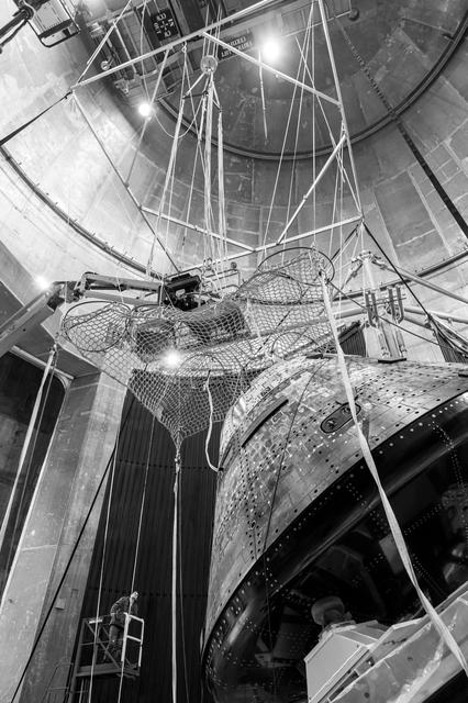 The Orion Crew Module, also known as the Orion Environmental Test Article (ETA), returned to NASA’s Neil Armstrong Test Facility in Sandusky, Ohio, in January 2024 and completed an 11-month test campaign necessary for the safety and success of Artemis II. In November 2024, experts completed the Forward Bay Cover jettison test, which is the last piece that must eject right before parachutes deploy. This image shows the setup right before the FBC deployment test. Photo Credit: (NASA/Jordan Salkin)
