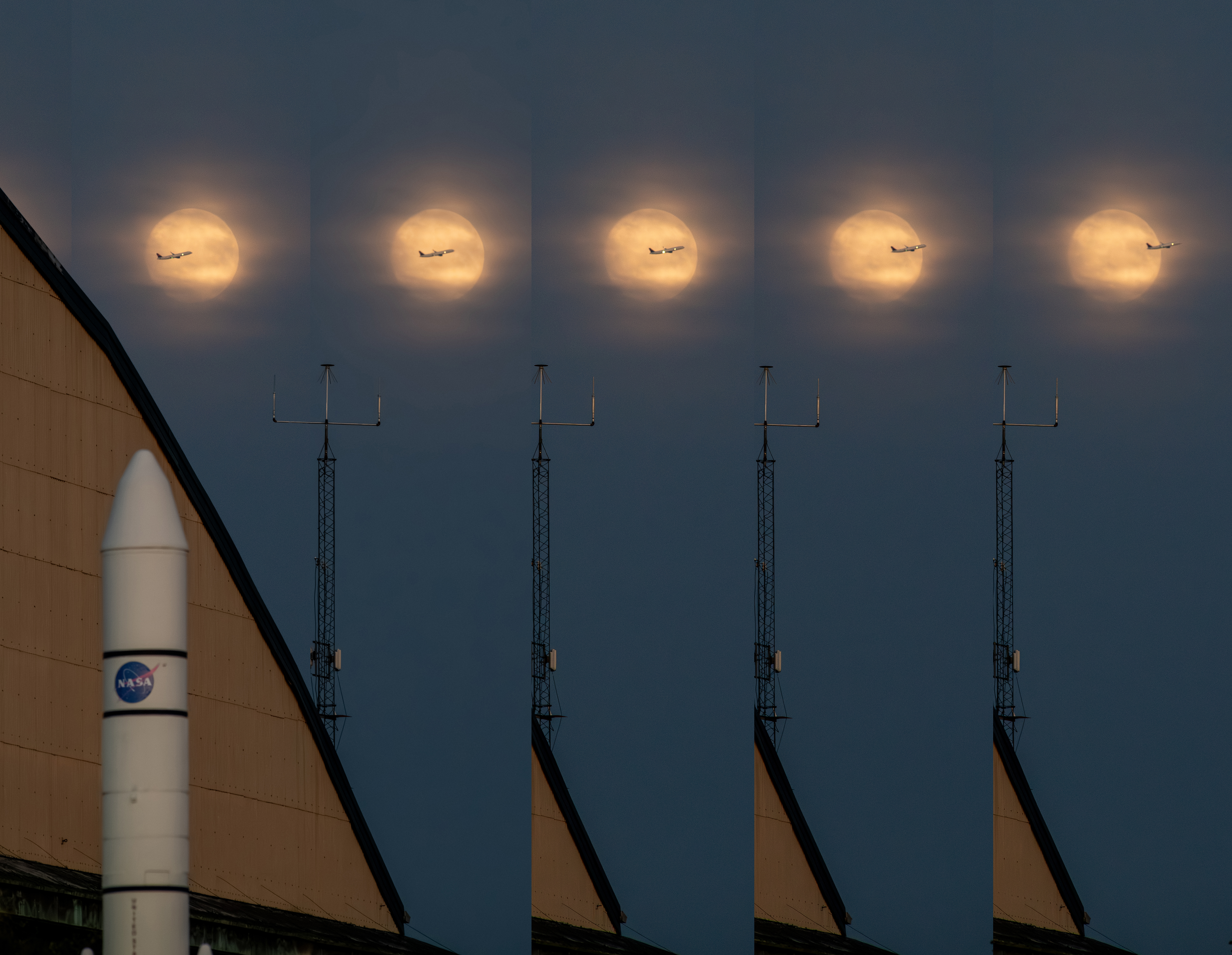 While photographing the Supermoon on September 17, 2024 for a NASA GRC Aerospace Frontiers article on the 2024 Supermoon, a plane departing Cleveland Hopkins Airport flew right through the middle of the moon. The photographer used a portion of the rocket garden’s Ares 1 rocket and a corner of the NASA GRC hangar building to frame the photograph of the moon. When the plane was seen approaching, the photographer used continuous shutter speed in hopes of capturing the plane and the moon together