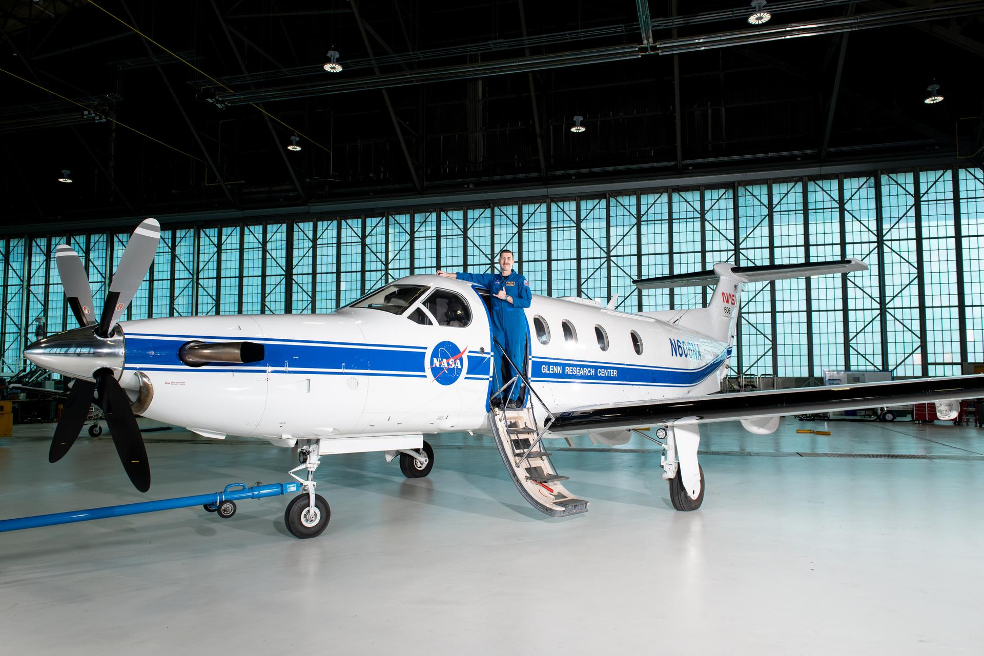 Jeremy Johnson, a research pilot and aviation safety officer, poses in front of a PC-12 aircraft inside the hangar at NASA’s Glenn Research Center in Cleveland on Thursday, April 17, 2025. Johnson flies NASA planes to support important scientific research and testing, working with researchers to plan and carry out flights that will get them the data they need while ensuring safety.