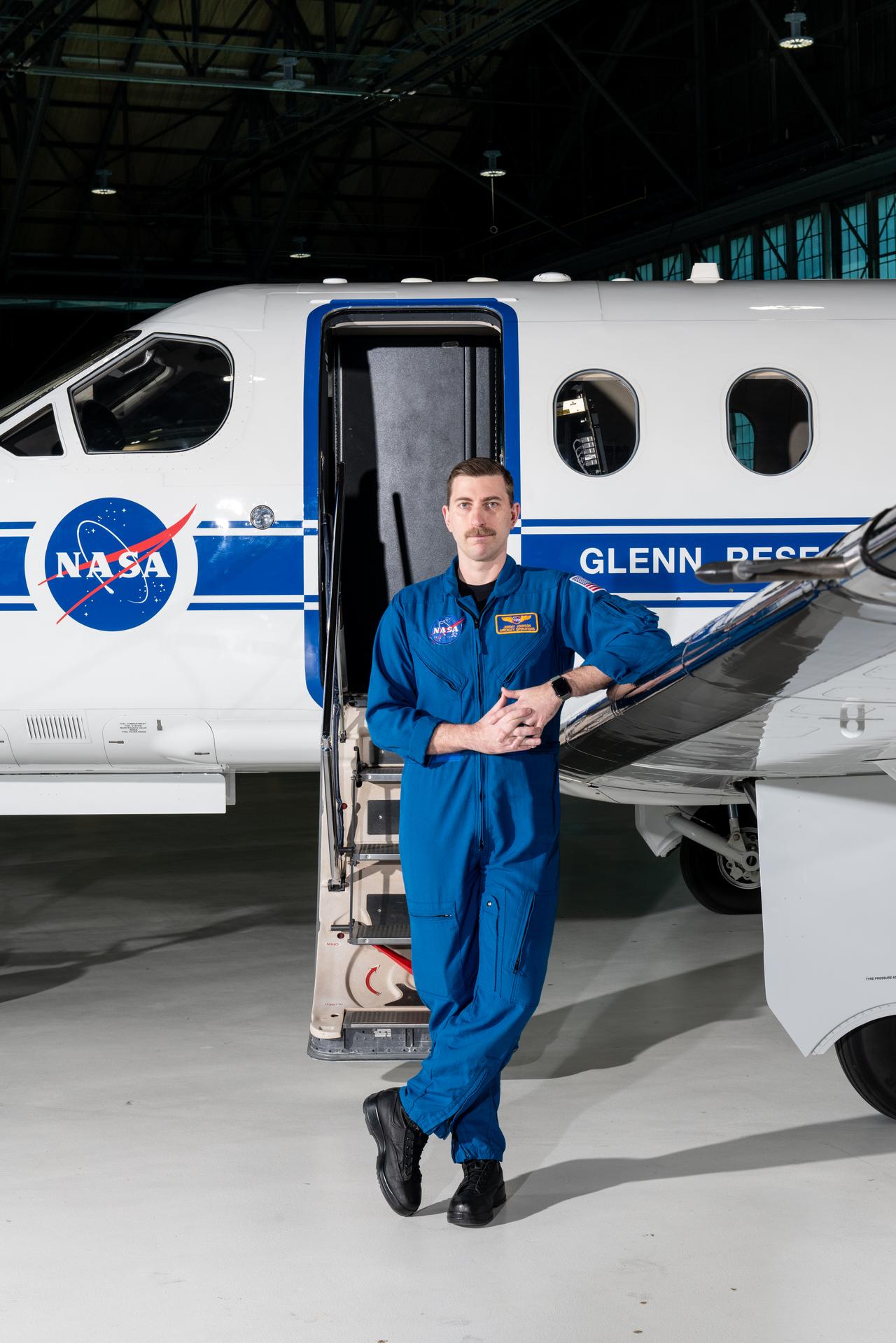 Jeremy Johnson, a research pilot and aviation safety officer, poses in front of a PC-12 aircraft inside the hangar at NASA’s Glenn Research Center in Cleveland on Thursday, April 17, 2025. Johnson flies NASA planes to support important scientific research and testing, working with researchers to plan and carry out flights that will get them the data they need while ensuring safety.