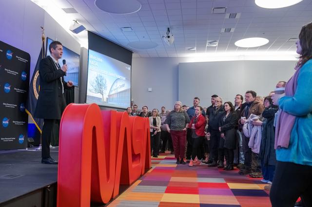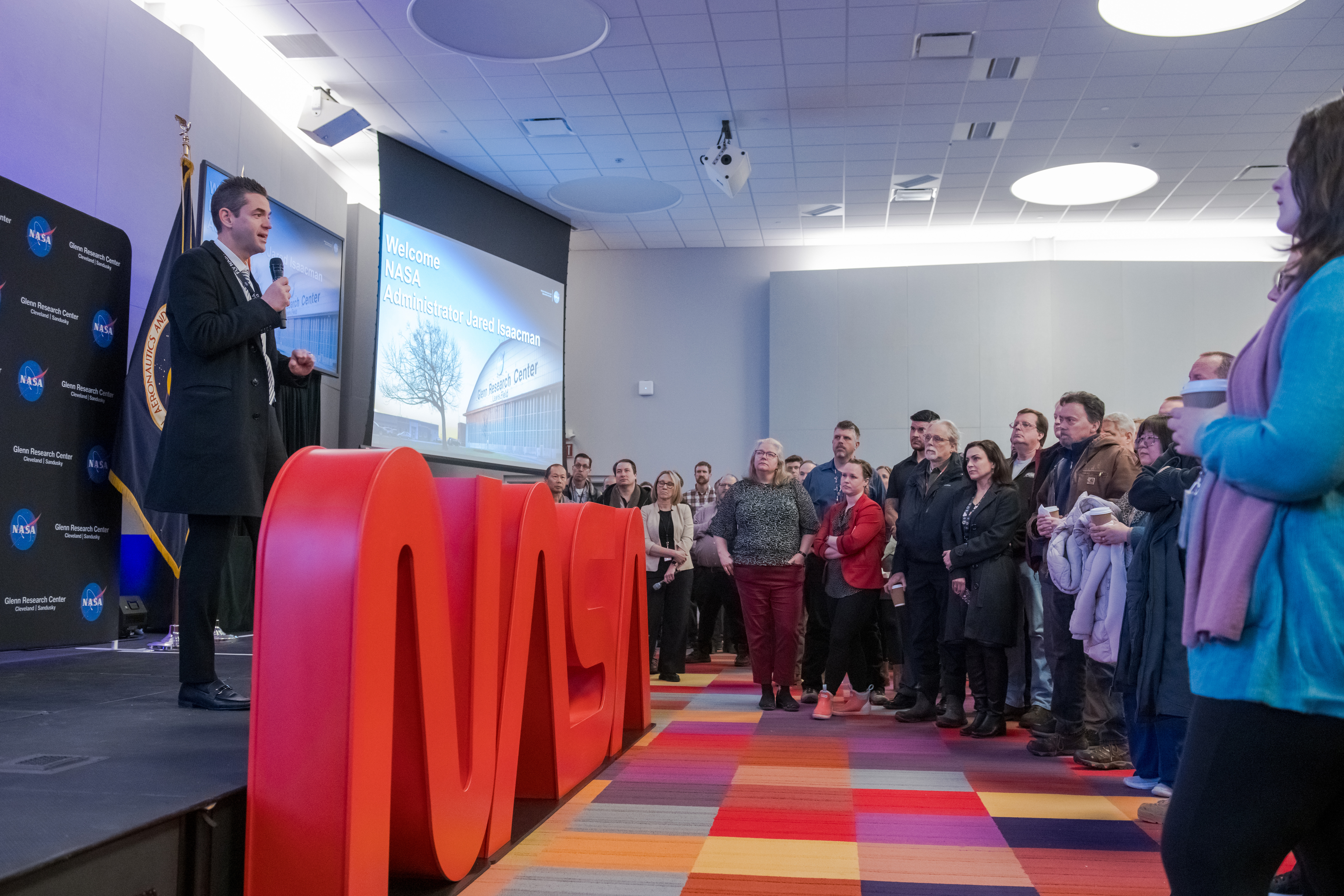 NASA Administrator Jared Isaacman speaks with staff in the Mission Integration Auditorium Center during a visit to NASA's Glenn Research Center in Cleveland on Jan. 27, 2026.