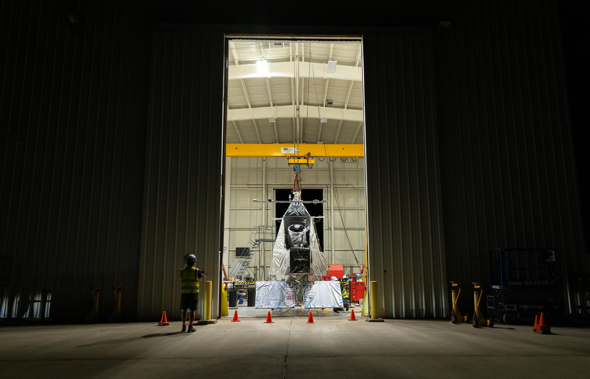 NASA Goddard astrophysicist Kyle Helson looks at EXCITE (EXoplanet Climate Infrared TElescope) as it dangles from the ceiling of a hangar at NASA’s Columbia Scientific Balloon Facility in Fort Sumner, New Mexico.