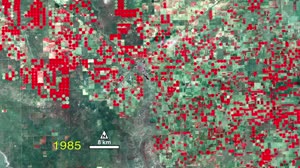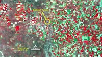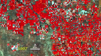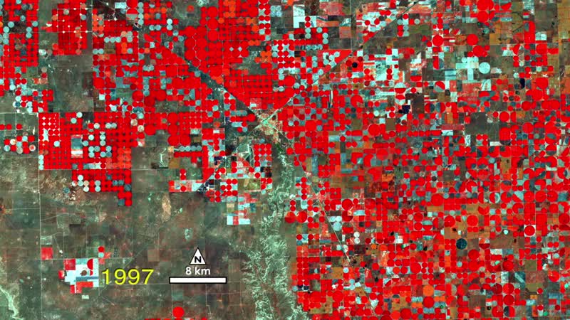 A water-rich polka dot pattern takes over the traditional rectangular patchwork of fields in this 40 year sequence of Landsat images showing the dry Texas panhandle near the town of Dalhart. In this series, vegetation appears red and the bare soil of fallow fields or sparsely vegetated grasslands appear white to green. The blue-gray X near the center of the images marks the town of Dalhart.