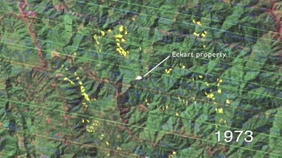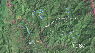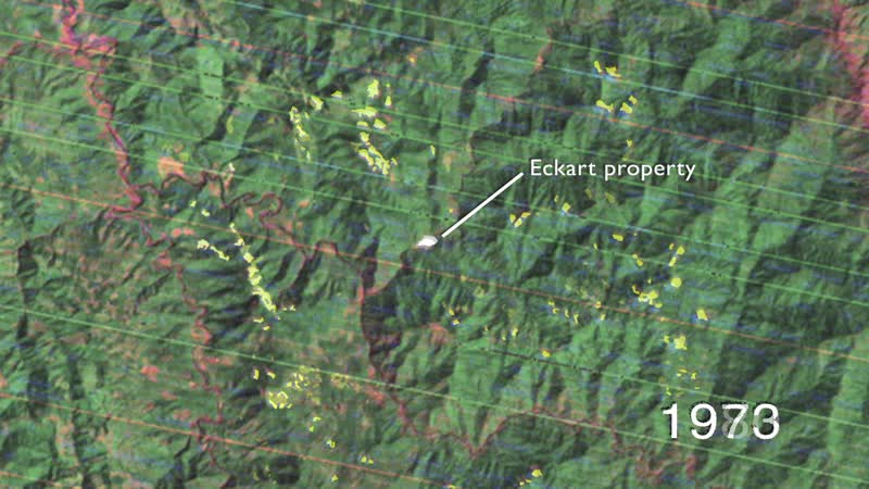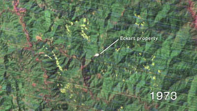 Forest fires and logging are the two main drivers of change in this area within Trinity National Forest in northern California. Roger Eckart and his siblings bought a grandfathered-in piece of private land within the forest in 1972, and so together the Eckart family and the Landsat program have observed changes in the forest for over 40 years.