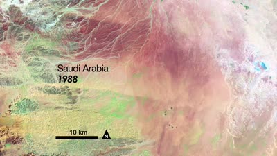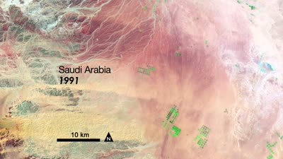Saudi Arabia is drilling for a resource possibly more precious than oil. Over the last 24 years, it has tapped hidden reserves of water to grow wheat and other crops in the Syrian Desert. This time series of data shows images acquired by three different Landsat satellites operated by NASA and the U.S. Geological Survey. The green fields that dot the desert draw on water that in part was trapped during the last Ice Age. In addition to rainwater that fell over several hundred thousand years, this fossil water filled aquifers that are now buried deep under the desert's shifting sands. Saudi Arabia reaches these underground rivers and lakes by drilling through the desert floor, directly irrigating the fields with a circular sprinkler system. This technique is called center-pivot irrigation. Because rainfall in this area is now only a few centimeters (about one inch) each year, water here is a non-renewable resource. Although no one knows how much water is beneath the desert, hydrologists estimate it will only be economical to pump water for about 50 years. In this series of four Landsat images, the agricultural fields are about one kilometer (.62 miles) across. The images were created using reflected light from the short wave-infrared, near-infrared, and green portions of the electromagnetic spectrum (bands 7, 4, and 2 from Landsat 4 and 5 TM and Landsat 7 ETM+ sensors). Using this combination of wavelengths, healthy vegetation appears bright green while dry vegetation appears orange. Barren soil is a dark pink, and urban areas, like the town of Tubarjal at the top of each image, have a purple hue. Landsat 4 launched in 1982 and provided scientific data for 11 years until 1993. NASA launched Landsat 5 in 1984 and it ran a record-breaking 28 years, sending back what was likely its last data in 2011. Landsat 7 is still up and running; it was launched in 1999. The data from these and other Landsat satellites has been instrumental in increasing our understanding of forest health, storm damage, agricultural trends, urban growth, and many other ongoing changes to our land. NASA and the U.S. Department of the Interior through the U.S. Geological Survey (USGS) jointly manage Landsat, and the USGS preserves a 40-year archive of Landsat images that is freely available data over the Internet.