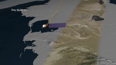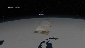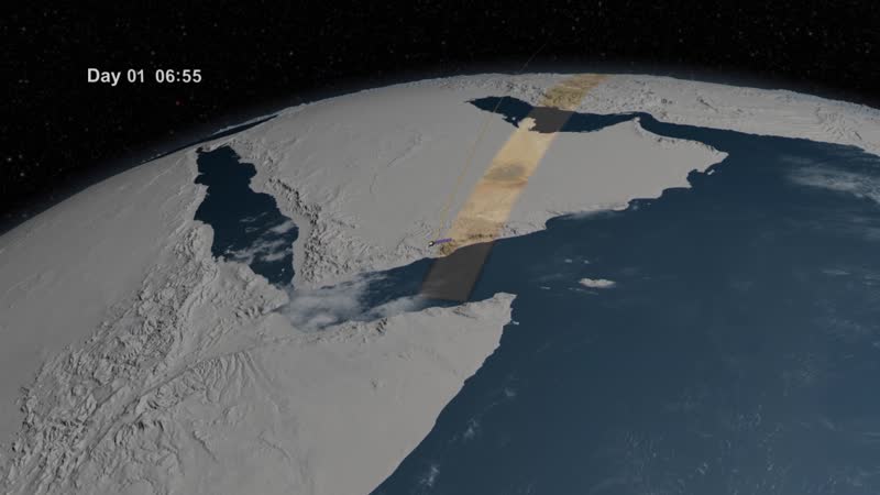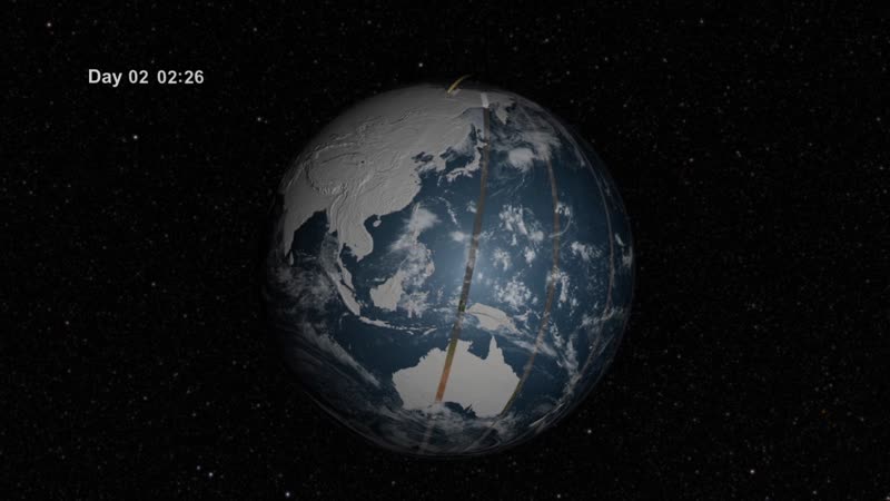 This visualization of the orbit of Landsat 8 is narrated by Jim Irons, LDCM Project Scientist at NASA's Goddard Space Flight Center. As a Landsat satellite flies over the surface of the Earth the instruments aboard the satellite are able to view a swath 185 kilometers wide and collect images along that swath as the satellite proceeds through its orbit. The spacecraft travels at approximately 4.7 miles per second. The satellite travels from north to south while it's over the sunlit portion of the Earth, and travels south to north over the dark side of the Earth. One orbit takes about 99 minutes, so that's about approximately 15 orbits in a 24 hour period. The orbit's maintained such that after 16 days, the entire surface of the Earth has come within view of the Landsat instruments, while sunlit, and then on day 17 the first ground path is repeated. So we get to view the entire surface once every 16 days.