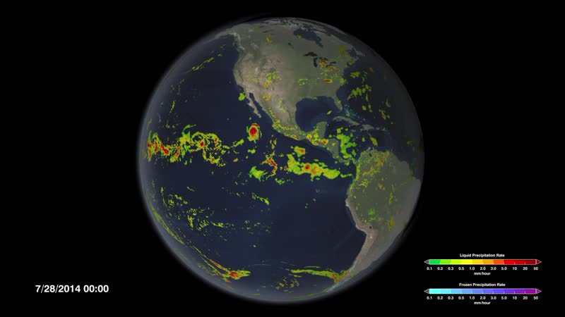 Rain, snow, hail, ice, and every slushy mix in between make up the precipitation that touches everyone on our planet. But not all places rain equally. Precipitation falls differently in different parts of the world, as you see in NASA's new video that captures every shower, every snow storm and every hurricane from August 4 to August 14, 2014. The GPM Core Observatory, co-led by NASA and the Japan Aerospace Exploration Agency (JAXA), was launched on Feb 27, 2014, and provides advanced instruments that can see rain and falling snow all the way through the atmosphere. This Core Observatory serves as the reference standard to unite preciptiation observations from a dozen satellites, which together produce the most detailed world-wide view of everything from light rain to heavy rain and, for the first time, falling snow. Scientists merged data from 12 precipitation satellites into a single seamless map called the Integrated Multi-satellite Retrievals for Global Precipitation Measurement (GPM), or IMERG. Every 30 minutes, IMERG generates a new global map with a resolution of 10 kilometers by 10 km (6.2 miles by 6.2 mi), about the size of a small suburb. These comprehensive maps allow scientists to observe changes in precipitation patterns across 87 percent of the globe and through time.
