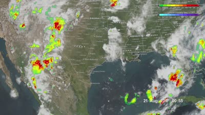 The Global Precipitation Measurement (GPM) Core Observatory captured these images of Hurricane Harvey at 11:45 UTC and 21:25 UTC on the 27th of August nearly two days after the storm made landfall as it was meandering slowly southeast at just 2 mph (~4 kph) near Victoria, Texas west of Houston. The image shows rain rates derived from GPM's GMI microwave imager (outer swath) and dual-frequency precipitation radar or DPR (inner swath) overlaid on enhanced visible/infrared data from the GOES-East satellite. Harvey's cyclonic circulation is still quite evident in the visible/infrared clouds, but GPM shows that the rainfall pattern is highly asymmetric with the bulk of the rain located north and east of the center. A broad area of moderate rain can be seen stretching from near Galveston Bay to north of Houston and back well to the west. Within this are embedded areas of heavy rain (red areas); the peak estimated rain rate from GPM at the time of this overpass was 96 mm/hr (~3.77 inches per hour). With Harvey's circulation still reaching out over the Gulf, the storm is able to draw in a continuous supply of warm moist air to sustain the large amount of rain it is producing.