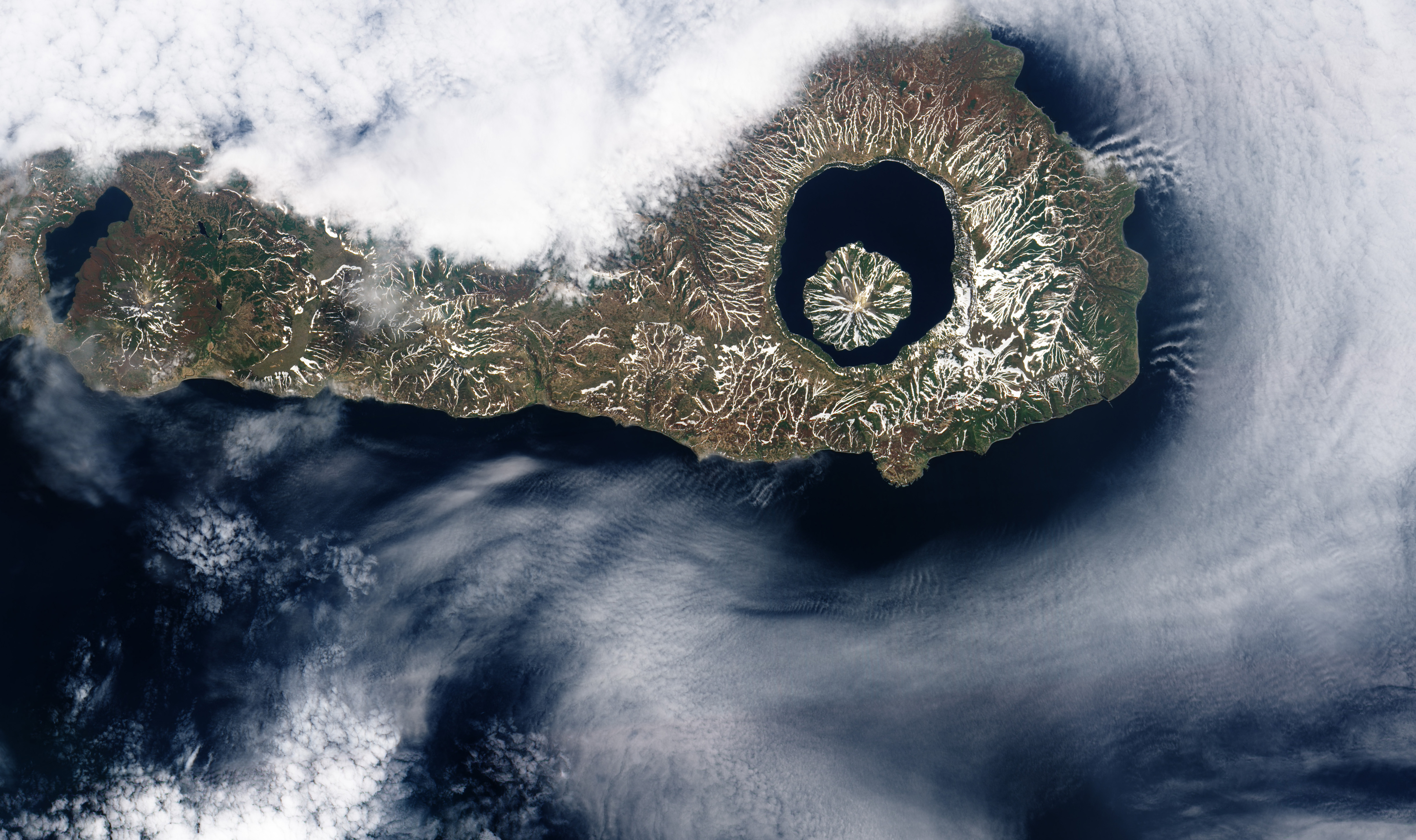 More than 9,000 years ago, a catastrophic volcanic eruption created a huge caldera on the southern end of Onekotan Island, one of the Kuril Islands, located off the southern tip of Russia’s Kamchatka Peninsula. Today, the ancient Tao-Rusyr Caldera is filled by the deep blue waters of Kal’tsevoe Lake. The Advanced Land Imager (ALI) on NASA’s Earth Observing-1 (EO-1) satellite acquired this true-color image of southern Onekotan on June 10, 2009. In this late-spring shot, snow or ice lingers on the land, forming white streaks on a brown-and-green land surface. In the northwest quadrant of the caldera is Krenitzyn Peak, which rises to a height of 1,325 meters (4,347 feet). Like the other Kuril Islands, Onekotan lies along the Pacific “Ring of Fire.” The Kuril Island volcanoes are fueled by magma generated by the subduction of the Pacific Plate under the Eurasian Plate, which takes place along a deep trench about 200 kilometers (120 miles) to the islands’ east. The only historical eruption at Krenitzyn Peak occurred in 1952, a week after a magnitude 9.0 earthquake along the subduction fault. NASA Earth Observatory image created by Robert Simmon, using EO-1 ALI data provided courtesy of the NASA EO-1 team. Caption by Michon Scott and Rebecca Lindsey. <b><a href="http://www.nasa.gov/audience/formedia/features/MP_Photo_Guidelines.html" rel="nofollow">NASA image use policy.</a></b> <b><a href="http://www.nasa.gov/centers/goddard/home/index.html" rel="nofollow">NASA Goddard Space Flight Center</a></b> enables NASA’s mission through four scientific endeavors: Earth Science, Heliophysics, Solar System Exploration, and Astrophysics. Goddard plays a leading role in NASA’s accomplishments by contributing compelling scientific knowledge to advance the Agency’s mission. <b>Follow us on <a href="http://twitter.com/NASAGoddardPix" rel="nofollow">Twitter</a></b> <b>Like us on <a href="http://www.facebook.com/pages/Greenbelt-MD/NASA-Goddard/395013845897?ref=tsd" rel="nofollow">Facebook</a></b> <b>Find us on <a href="http://instagrid.me/nasagoddard/?vm=grid" rel="nofollow">Instagram</a></b>