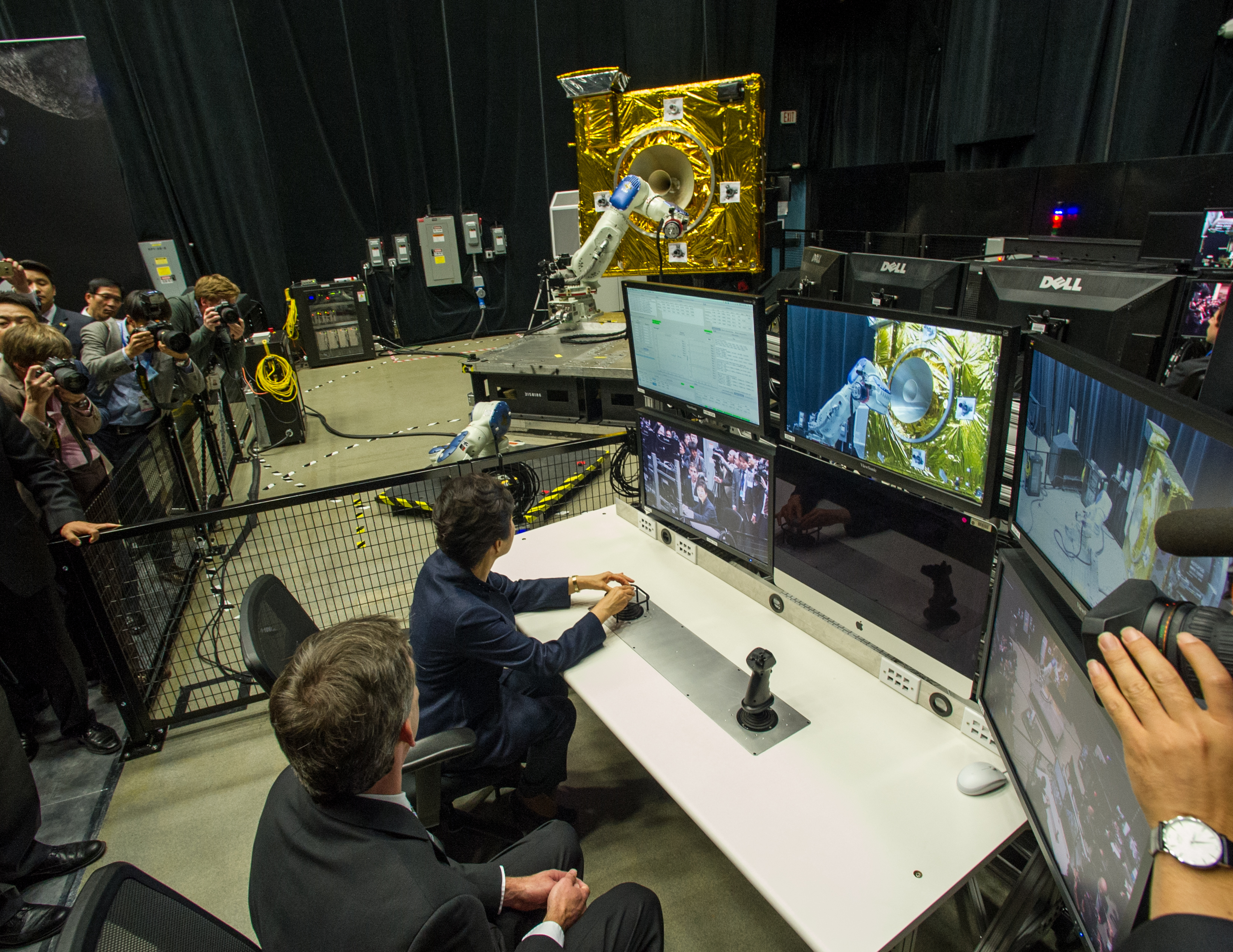 President Park Geun-hye of South Korea operates a robotic arm as Brian Roberts, Robotic Operations Manager at NASA Goddard describes the operations that take place in the Satellite Servicing Capabilities Office’s robotic lab. As part of her visit to the United States, President Park Geun-hye of South Korea visited NASA’s Goddard Space Flight Center in Greenbelt, Md. On Oct. 14, 2015. The visit offered an opportunity to celebrate past collaborative efforts between the American and South Korean space programs along with presentations on current projects and programs underway at Goddard. Credit: NASA/Goddard/Bill Hrybyk <b><a href="http://www.nasa.gov/audience/formedia/features/MP_Photo_Guidelines.html" rel="nofollow">NASA image use policy.</a></b> <b><a href="http://www.nasa.gov/centers/goddard/home/index.html" rel="nofollow">NASA Goddard Space Flight Center</a></b> enables NASA’s mission through four scientific endeavors: Earth Science, Heliophysics, Solar System Exploration, and Astrophysics. Goddard plays a leading role in NASA’s accomplishments by contributing compelling scientific knowledge to advance the Agency’s mission. <b>Follow us on <a href="http://twitter.com/NASAGoddardPix" rel="nofollow">Twitter</a></b> <b>Like us on <a href="http://www.facebook.com/pages/Greenbelt-MD/NASA-Goddard/395013845897?ref=tsd" rel="nofollow">Facebook</a></b> <b>Find us on <a href="http://instagrid.me/nasagoddard/?vm=grid" rel="nofollow">Instagram</a></b>