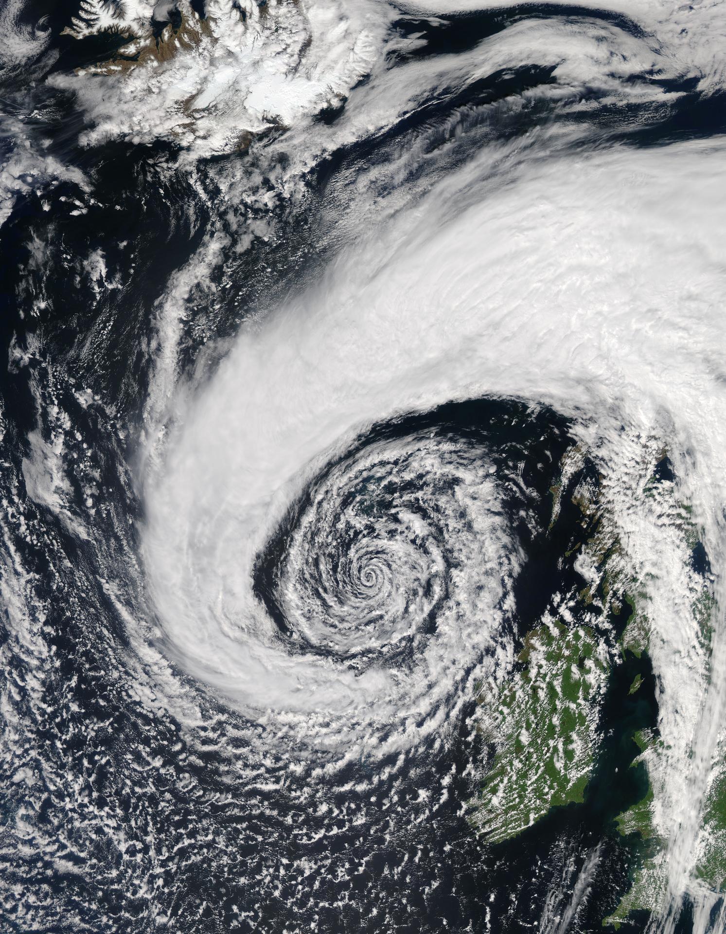 In early June, 2015 a strong low pressure system over the North Atlantic Ocean brought rain and gusty winds to Ireland and the United Kingdom. The Moderate Resolution Imaging Spectroradiometer (MODIS) aboard NASA’s Aqua satellite captured this true-color image of the spiraling system on June 5. A very deep low pressure area lies in the center of the spiral, just off the northwestern shore of emerald-green Ireland. Bands of cloud, containing rain and thunderstorms, swirl into the center of the low, and extend over the British Isles. A low pressure system will pull in air from the surrounding area, creating spiraling winds. Winds around the center of a low pressure spiral counterclockwise in the Northern Hemisphere, as we see here (clockwise in the Southern Hemisphere) and towards the center of the system. Although the system was impressive on June 5, it intensified over the next several days. According to MarkVoganWeather.com, by June 7 the pressure in the unusually deep Atlantic low, which had been hanging around 980mb, was expected to drop lower to about 978mb off of Anglesey, brining northwest gales along the Atlantic west and south coasts of Ireland, England and Wales. Winds gust of up to 80 mph were possible, along with heavy rains. Credit: Jeff Schmaltz, MODIS Land Rapid Response Team, NASA GSFC <b><a href="http://www.nasa.gov/audience/formedia/features/MP_Photo_Guidelines.html" rel="nofollow">NASA image use policy.</a></b> <b><a href="http://www.nasa.gov/centers/goddard/home/index.html" rel="nofollow">NASA Goddard Space Flight Center</a></b> enables NASA’s mission through four scientific endeavors: Earth Science, Heliophysics, Solar System Exploration, and Astrophysics. Goddard plays a leading role in NASA’s accomplishments by contributing compelling scientific knowledge to advance the Agency’s mission. <b>Follow us on <a href="http://twitter.com/NASAGoddardPix" rel="nofollow">Twitter</a></b> <b>Like us on <a href="http://www.facebook.com/pages/Greenbelt-MD/NASA-Goddard/395013845897?ref=tsd" rel="nofollow">Facebook</a></b> <b>Find us on <a href="http://instagrid.me/nasagoddard/?vm=grid" rel="nofollow">Instagram</a></b>