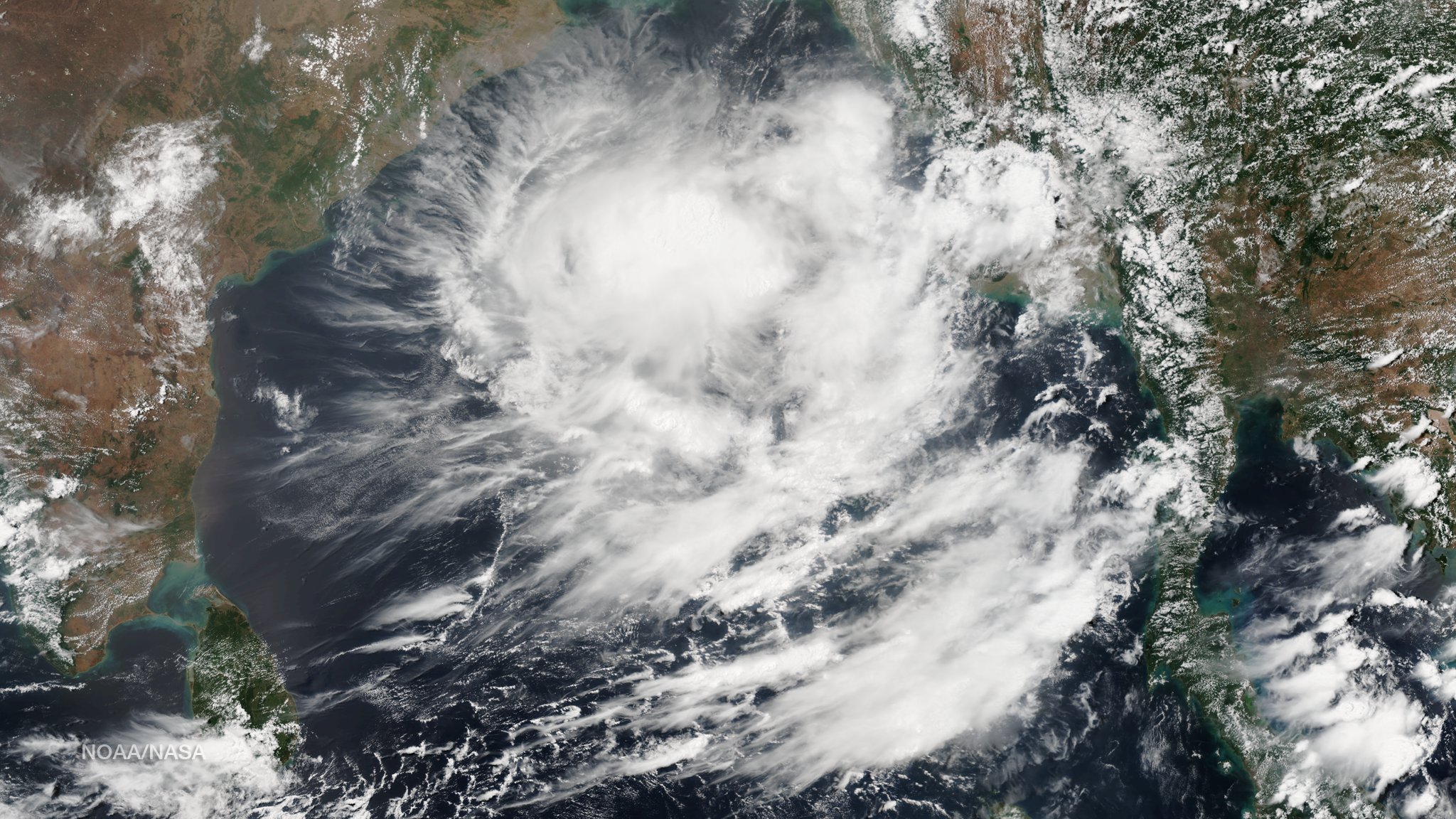 The Joint Typhoon Warning Center states that formation of a significant tropical cyclone is possible in the Bay of Bengal within the next 12 - 24 hours as of 0730Z on May 21, 2014. Along with deep convective banding associated with a consolidating low-level circulation center, warm sea surface temperatures are conducive for further development. This image was taken by the Suomi NPP satellite's VIIRS instrument in two passes, the east pass around 0615Z and the west pass around 0755Z on May 21, 2014. Credit: NASA/NOAA/NPP/VIIRS The Joint Typhoon Warning Center states that formation of a significant tropical cyclone is possible in the Bay of Bengal within the next 12 - 24 hours as of 0730Z on May 21, 2014. Along with deep convective banding associated with a consolidating low-level circulation center, warm sea surface temperatures are conducive for further development. This image was taken by the Suomi NPP satellite's VIIRS instrument in two passes, the east pass around 0615Z and the west pass around 0755Z on May 21, 2014.
