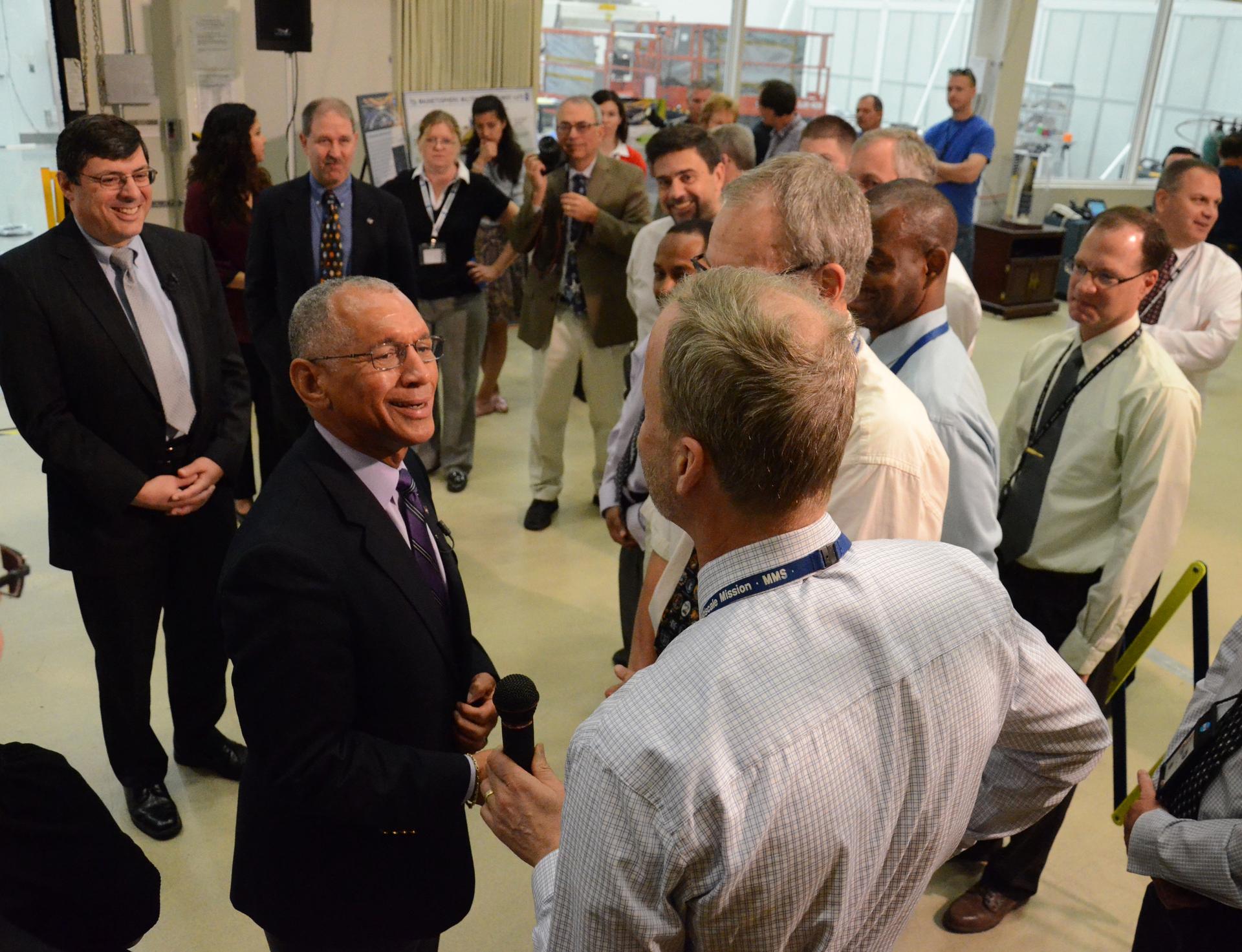 NASA Administrator Charles Bolden got a firsthand look at work being done on the four Magnetospheric Multiscale (MMS) spacecraft during his visit to the agency's Goddard Space Flight Center in Greenbelt, Maryland, on May 12. Standing 20 feet high inside a Goddard clean room, the spacecraft were in their "four-stack" formation, similar to how they will be arranged inside their launch vehicle. The MMS spacecraft recently completed vibration testing. With MMS as a backdrop, Bolden and Goddard Center Director Chris Scolese discussed the mission, ground testing and preparations for launch with project personnel. Read more: <a href="http://go.nasa.gov/1jSza7E" rel="nofollow">go.nasa.gov/1jSza7E</a> Credit: NASA/Goddard/Rebecca Roth <b><a href="http://www.nasa.gov/audience/formedia/features/MP_Photo_Guidelines.html" rel="nofollow">NASA image use policy.</a></b> <b><a href="http://www.nasa.gov/centers/goddard/home/index.html" rel="nofollow">NASA Goddard Space Flight Center</a></b> enables NASA’s mission through four scientific endeavors: Earth Science, Heliophysics, Solar System Exploration, and Astrophysics. Goddard plays a leading role in NASA’s accomplishments by contributing compelling scientific knowledge to advance the Agency’s mission. <b>Follow us on <a href="http://twitter.com/NASAGoddardPix" rel="nofollow">Twitter</a></b> <b>Like us on <a href="http://www.facebook.com/pages/Greenbelt-MD/NASA-Goddard/395013845897?ref=tsd" rel="nofollow">Facebook</a></b> <b>Find us on <a href="http://instagram.com/nasagoddard?vm=grid" rel="nofollow">Instagram</a></b>