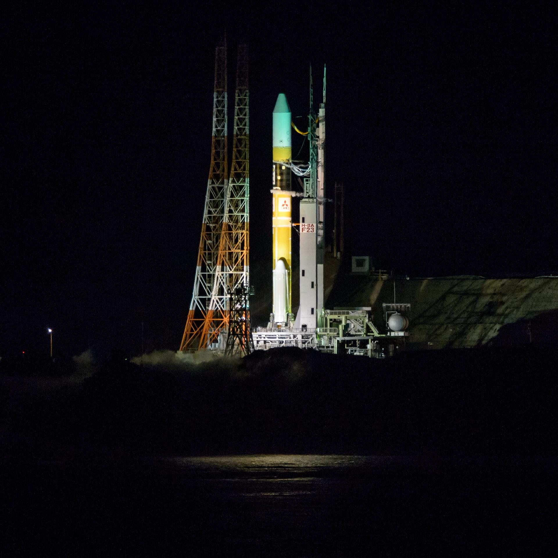 A Japanese H-IIA rocket with the NASA-Japan Aerospace Exploration Agency (JAXA), Global Precipitation Measurement (GPM) Core Observatory onboard, is seen on launch pad 1 of the Tanegashima Space Center, Friday, Feb. 28, 2014, Tanegashima, Japan. Once launched, the GPM spacecraft will collect information that unifies data from an international network of existing and future satellites to map global rainfall and snowfall every three hours. Photo Credit: (NASA/Bill Ingalls)