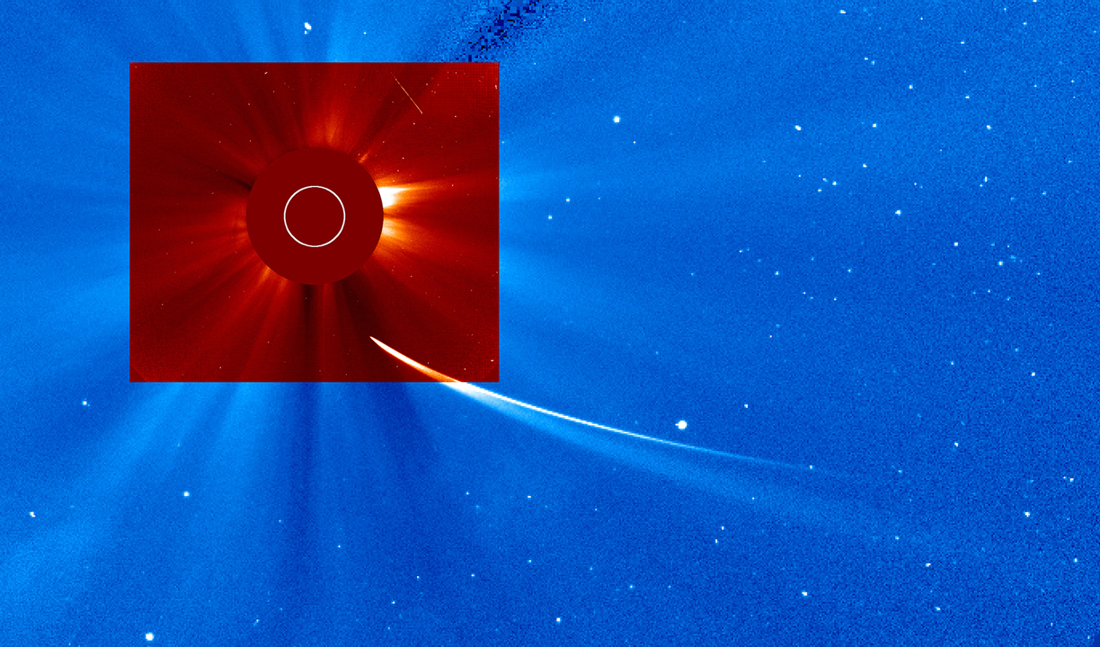 A merger of SOHO LASACO C2 data observed at 12:42 pm and C3 observed at 12:37 pm on November 28, 2013. Credit NASA/Goddard/SOHO