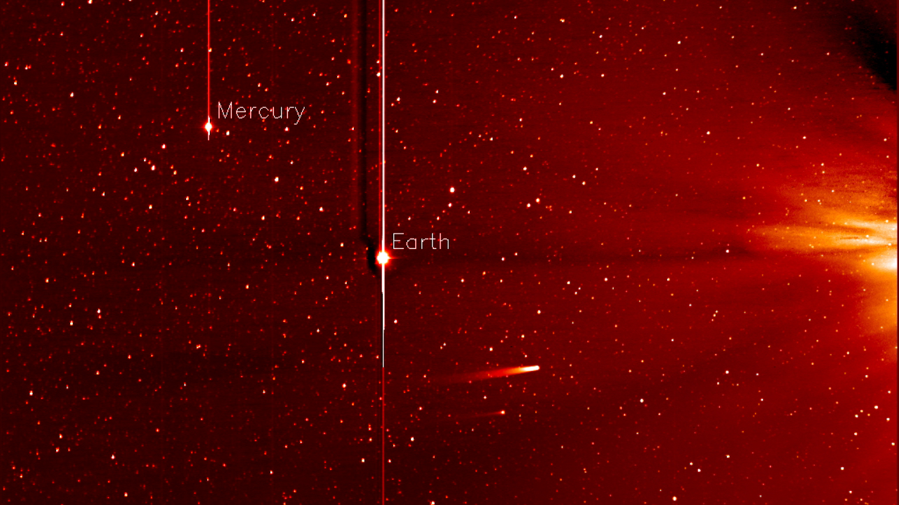 This movie from NASA’s STEREO spacecraft's Heliospheric Imager shows Comet ISON, Mercury, Comet Encke and Earth over a five-day period from Nov. 20 to Nov. 25, 2013. The sun sits right of the field of view of this camera. Comet ISON, which will round the sun on Nov. 28, is what's known as a sungrazing comet, due to its close approach. Foreshortening or the angle at which these images were obtained make Earth appear as if it is closer to the sun than Mercury. If you look closely you will also see a dimmer and smaller comet Encke near comet ISON. A comet’s journey through the solar system is perilous and violent. A giant ejection of solar material from the sun could rip its tail off. Before it reaches Mars -- at some 230 million miles away from the sun -- the radiation of the sun begins to boil its water, the first step toward breaking apart. And, if it survives all this, the intense radiation and pressure as it flies near the surface of the sun could destroy it altogether. Even if the comet does not survive, tracking its journey will help scientists understand what the comet is made of, how it reacts to its environment, and what this explains about the origins of the solar system. Closer to the sun, watching how the comet and its tail interact with the vast solar atmosphere can teach scientists more about the sun itself. Image Credit: NASA/STEREO <b><a href="http://www.nasa.gov/audience/formedia/features/MP_Photo_Guidelines.html" rel="nofollow">NASA image use policy.</a></b> <b><a href="http://www.nasa.gov/centers/goddard/home/index.html" rel="nofollow">NASA Goddard Space Flight Center</a></b> enables NASA’s mission through four scientific endeavors: Earth Science, Heliophysics, Solar System Exploration, and Astrophysics. Goddard plays a leading role in NASA’s accomplishments by contributing compelling scientific knowledge to advance the Agency’s mission. <b>Follow us on <a href="http://twitter.com/NASAGoddardPix" rel="nofollow">Twitter</a></b> <b>Like us on <a href="http://www.facebook.com/pages/Greenbelt-MD/NASA-Goddard/395013845897?ref=tsd" rel="nofollow">Facebook</a></b> <b>Find us on <a href="http://instagram.com/nasagoddard?vm=grid" rel="nofollow">Instagram</a></b>