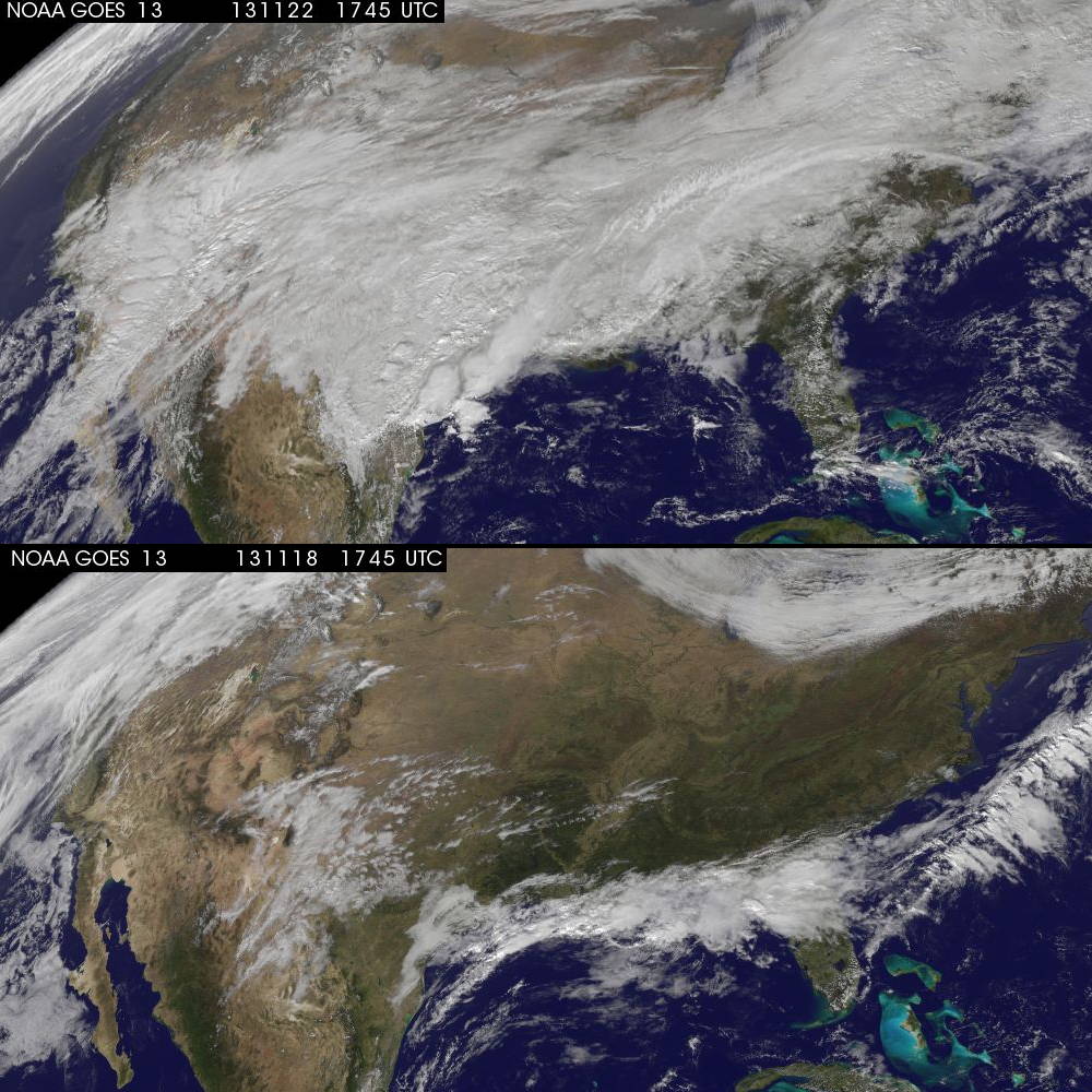 In autumn, cloud cover over the continental United States changes dramatically every few days, as these two remarkably opposite midday views show. In five days, clouds seemed to flip-flop over the U.S. These images were captured by NOAA's GOES-East satellite at 1745 UTC/12:45 p.m. EST on November 18 and 22, 2013. The images were created by Dennis Chesters of the NASA GOES Project at the NASA Goddard Space Flight Center in Greenbelt, Md. <b><a href="http://www.nasa.gov/audience/formedia/features/MP_Photo_Guidelines.html" rel="nofollow">NASA image use policy.</a></b> <b><a href="http://www.nasa.gov/centers/goddard/home/index.html" rel="nofollow">NASA Goddard Space Flight Center</a></b> enables NASA’s mission through four scientific endeavors: Earth Science, Heliophysics, Solar System Exploration, and Astrophysics. Goddard plays a leading role in NASA’s accomplishments by contributing compelling scientific knowledge to advance the Agency’s mission. <b>Follow us on <a href="http://twitter.com/NASA_GoddardPix" rel="nofollow">Twitter</a></b> <b>Like us on <a href="http://www.facebook.com/pages/Greenbelt-MD/NASA-Goddard/395013845897?ref=tsd" rel="nofollow">Facebook</a></b> <b>Find us on <a href="http://instagram.com/nasagoddard?vm=grid" rel="nofollow">Instagram</a></b>