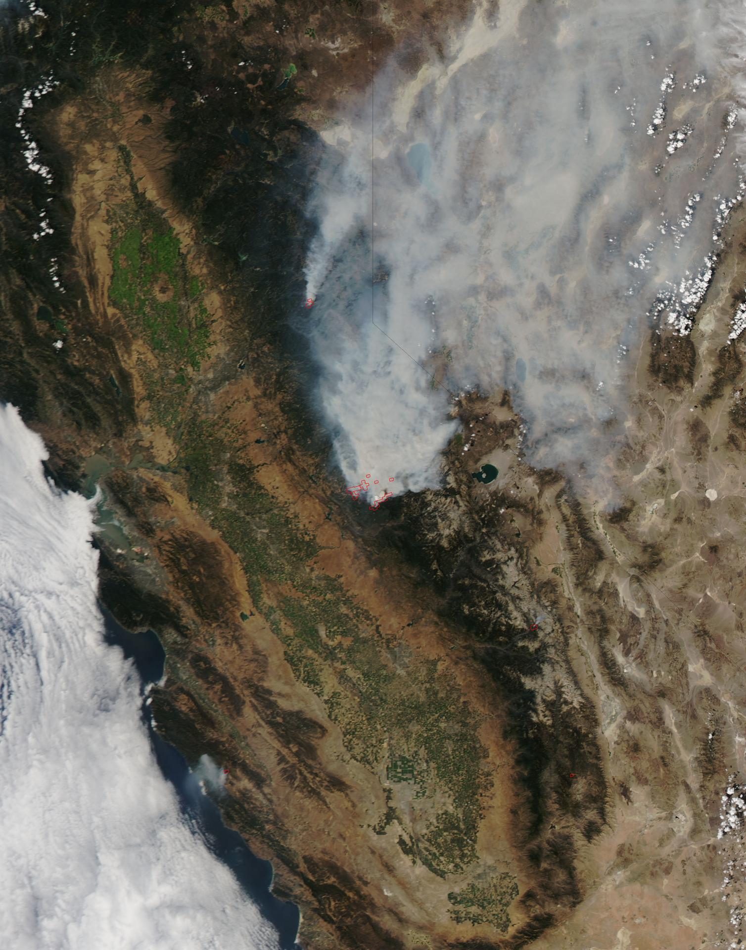 On August 23, 2013, the Moderate Resolution Imaging Spectroradiometer (MODIS) on NASA’s Aqua satellite acquired this image of the drought-fueled Rim fire burning in central California, near Yosemite National Park. Red outlines indicate hot spots where MODIS detected unusually warm surface temperatures associated with fires. Winds blew a thick smoke plume toward the northeast. A smaller fire—American fire—burned to the north. The lower image is a photograph that shows the fire burning at night on August 21. Started on August 17, 2013, the fast-moving fire had already charred more than 100,000 acres (40,000 hectares) by August 23, despite the efforts of more than 2,000 firefighters. Hundreds of people were forced to evacuate their homes, and roads in the area were closed. As of August 23, no structures had been reported destroyed, but the fire threatened the towns of Groveland and Pine Mountain Lake. By late August, wildfires had burned 3.4 million acres in the United States, making 2013 somewhat less active than other recent years. Over the last decade, fires charred 5.7 million acres on average by August 22, according to statistics published the National Interagency Fire Center. NASA image by Jeff Schmaltz, LANCE/EOSDIS Rapid Response. Caption by Adam Voiland. Instrument: Aqua - MODIS Credit: <b><a href="http://www.earthobservatory.nasa.gov/" rel="nofollow"> NASA Earth Observatory</a></b> <b><a href="http://www.nasa.gov/audience/formedia/features/MP_Photo_Guidelines.html" rel="nofollow">NASA image use policy.</a></b> <b><a href="http://www.nasa.gov/centers/goddard/home/index.html" rel="nofollow">NASA Goddard Space Flight Center</a></b> enables NASA’s mission through four scientific endeavors: Earth Science, Heliophysics, Solar System Exploration, and Astrophysics. Goddard plays a leading role in NASA’s accomplishments by contributing compelling scientific knowledge to advance the Agency’s mission. <b>Follow us on <a href="http://twitter.com/NASA_GoddardPix" rel="nofollow">Twitter</a></b> <b>Like us on <a href="http://www.facebook.com/pages/Greenbelt-MD/NASA-Goddard/395013845897?ref=tsd" rel="nofollow">Facebook</a></b> <b>Find us on <a href="http://instagram.com/nasagoddard?vm=grid" rel="nofollow">Instagram</a></b>