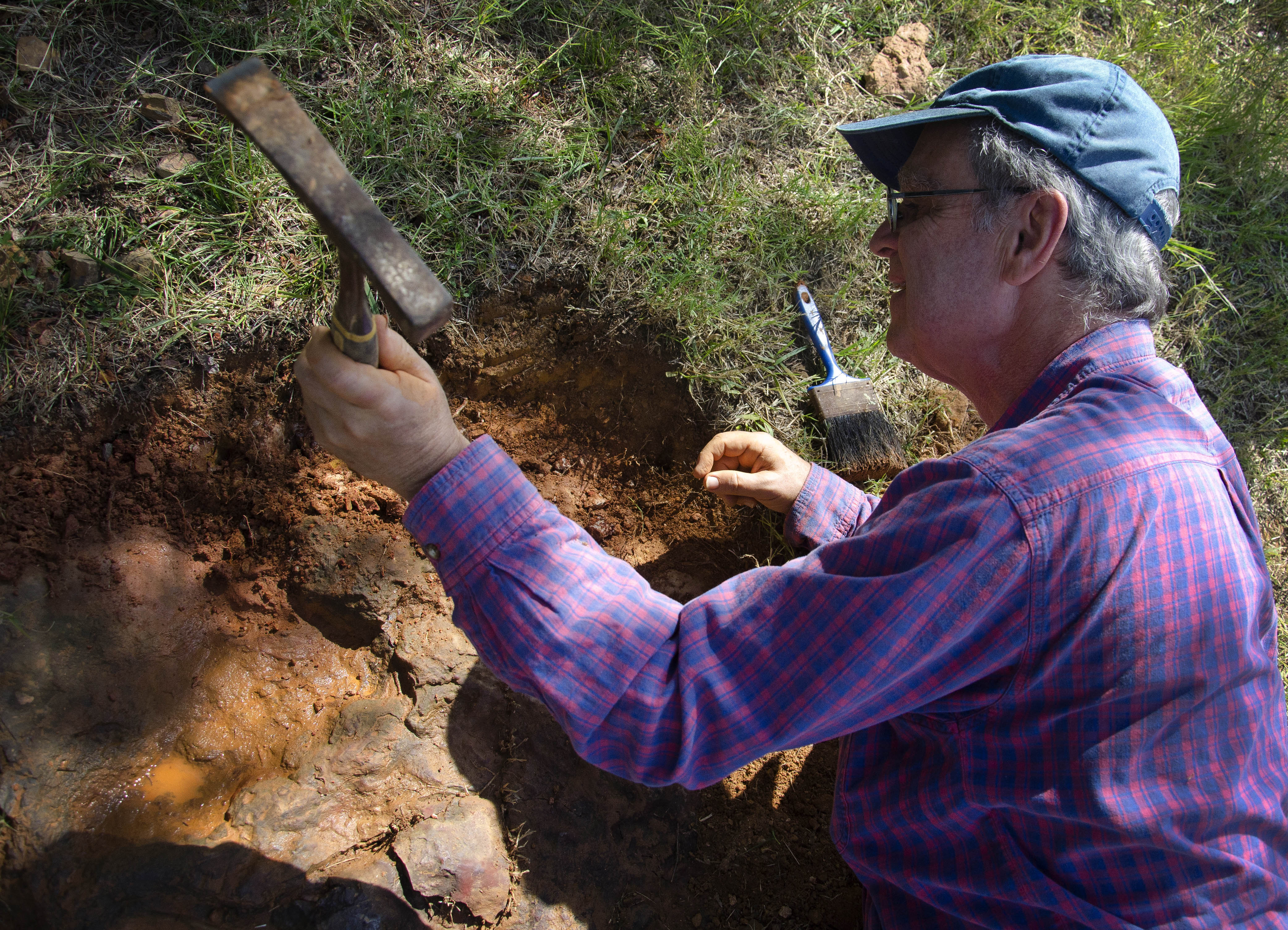 Dr. Robert Weems, emeritus paleontologist for the USGS verifies the recently discovered dinosaur track found on the NASA Goddard Space Flight Center campus. This imprint shows the right rear foot of a nodosaur - a low-slung, spiny leaf-eater - apparently moving in haste as the heel did not fully settle in the cretaceous mud, according to dinosaur tracker Ray Stanford. It was found recently on NASA's Goddard Space Flight Center campus and is being preserved for study. To read more about this discovery go to: <a href="http://1.usa.gov/P9NYg7" rel="nofollow">1.usa.gov/P9NYg7</a> Credit: NASA/GSFC/Rebecca Roth <b><a href="http://www.nasa.gov/audience/formedia/features/MP_Photo_Guidelines.html" rel="nofollow">NASA image use policy.</a></b> <b><a href="http://www.nasa.gov/centers/goddard/home/index.html" rel="nofollow">NASA Goddard Space Flight Center</a></b> enables NASA’s mission through four scientific endeavors: Earth Science, Heliophysics, Solar System Exploration, and Astrophysics. Goddard plays a leading role in NASA’s accomplishments by contributing compelling scientific knowledge to advance the Agency’s mission. <b>Follow us on <a href="http://twitter.com/NASA_GoddardPix" rel="nofollow">Twitter</a></b> <b>Like us on <a href="http://www.facebook.com/pages/Greenbelt-MD/NASA-Goddard/395013845897?ref=tsd" rel="nofollow">Facebook</a></b> <b>Find us on <a href="http://instagrid.me/nasagoddard/?vm=grid" rel="nofollow">Instagram</a></b>