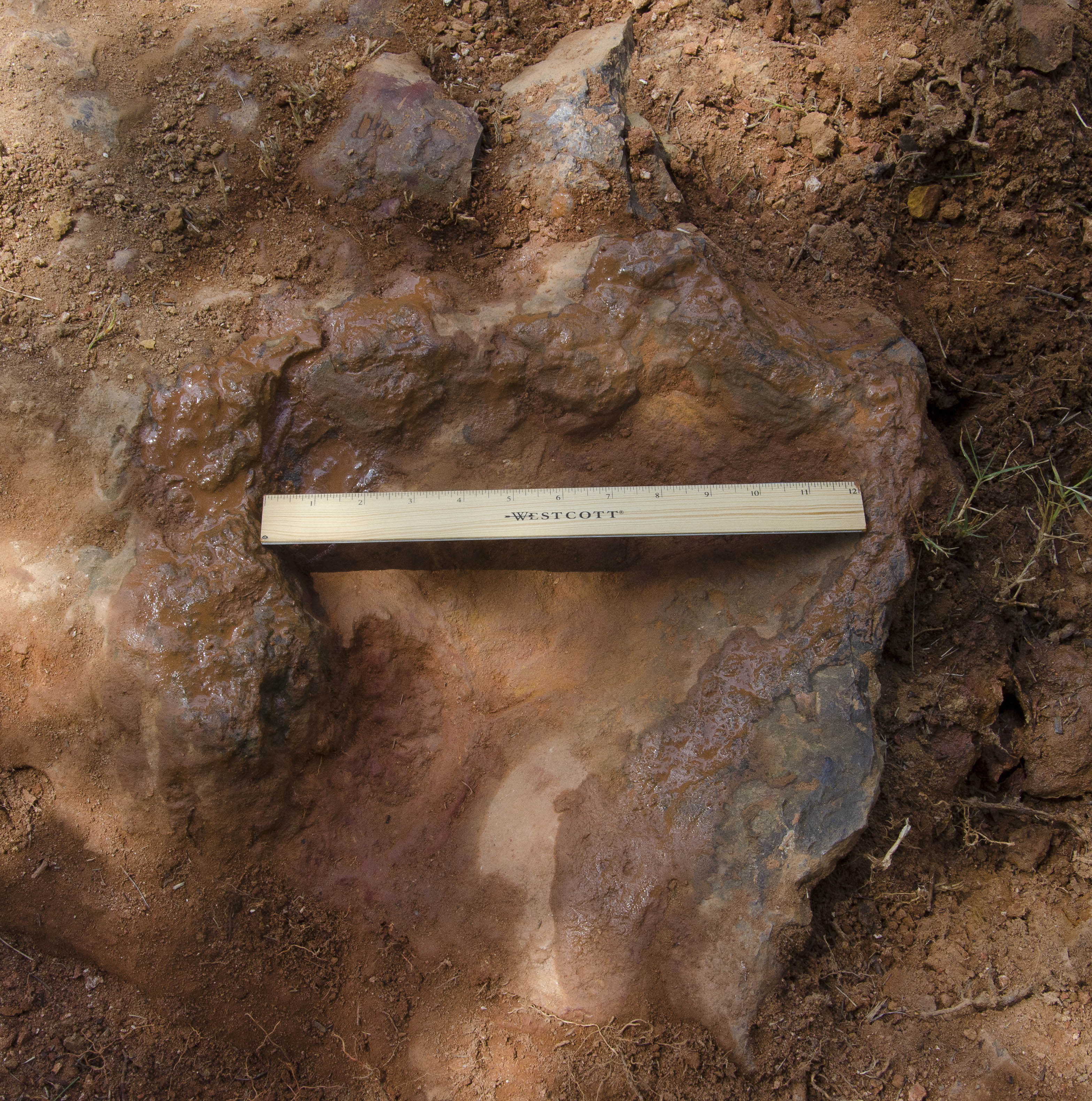 This imprint shows the right rear foot of a nodosaur - a low-slung, spiny leaf-eater - apparently moving in haste as the heel did not fully settle in the cretaceous mud, according to dinosaur tracker Ray Stanford. It was found recently on NASA's Goddard Space Flight Center campus and is being preserved for study. This imprint shows the right rear foot of a nodosaur - a low-slung, spiny leaf-eater - apparently moving in haste as the heel did not fully settle in the cretaceous mud, according to dinosaur tracker Ray Stanford. It was found recently on NASA's Goddard Space Flight Center campus and is being preserved for study. To read more go to: <a href="http://1.usa.gov/P9NYg7" rel="nofollow">1.usa.gov/P9NYg7</a> Credit: NASA/GSFC/Rebecca Roth <b><a href="http://www.nasa.gov/audience/formedia/features/MP_Photo_Guidelines.html" rel="nofollow">NASA image use policy.</a></b> <b><a href="http://www.nasa.gov/centers/goddard/home/index.html" rel="nofollow">NASA Goddard Space Flight Center</a></b> enables NASA’s mission through four scientific endeavors: Earth Science, Heliophysics, Solar System Exploration, and Astrophysics. Goddard plays a leading role in NASA’s accomplishments by contributing compelling scientific knowledge to advance the Agency’s mission. <b>Follow us on <a href="http://twitter.com/NASA_GoddardPix" rel="nofollow">Twitter</a></b> <b>Like us on <a href="http://www.facebook.com/pages/Greenbelt-MD/NASA-Goddard/395013845897?ref=tsd" rel="nofollow">Facebook</a></b> <b>Find us on <a href="http://instagrid.me/nasagoddard/?vm=grid" rel="nofollow">Instagram</a></b>