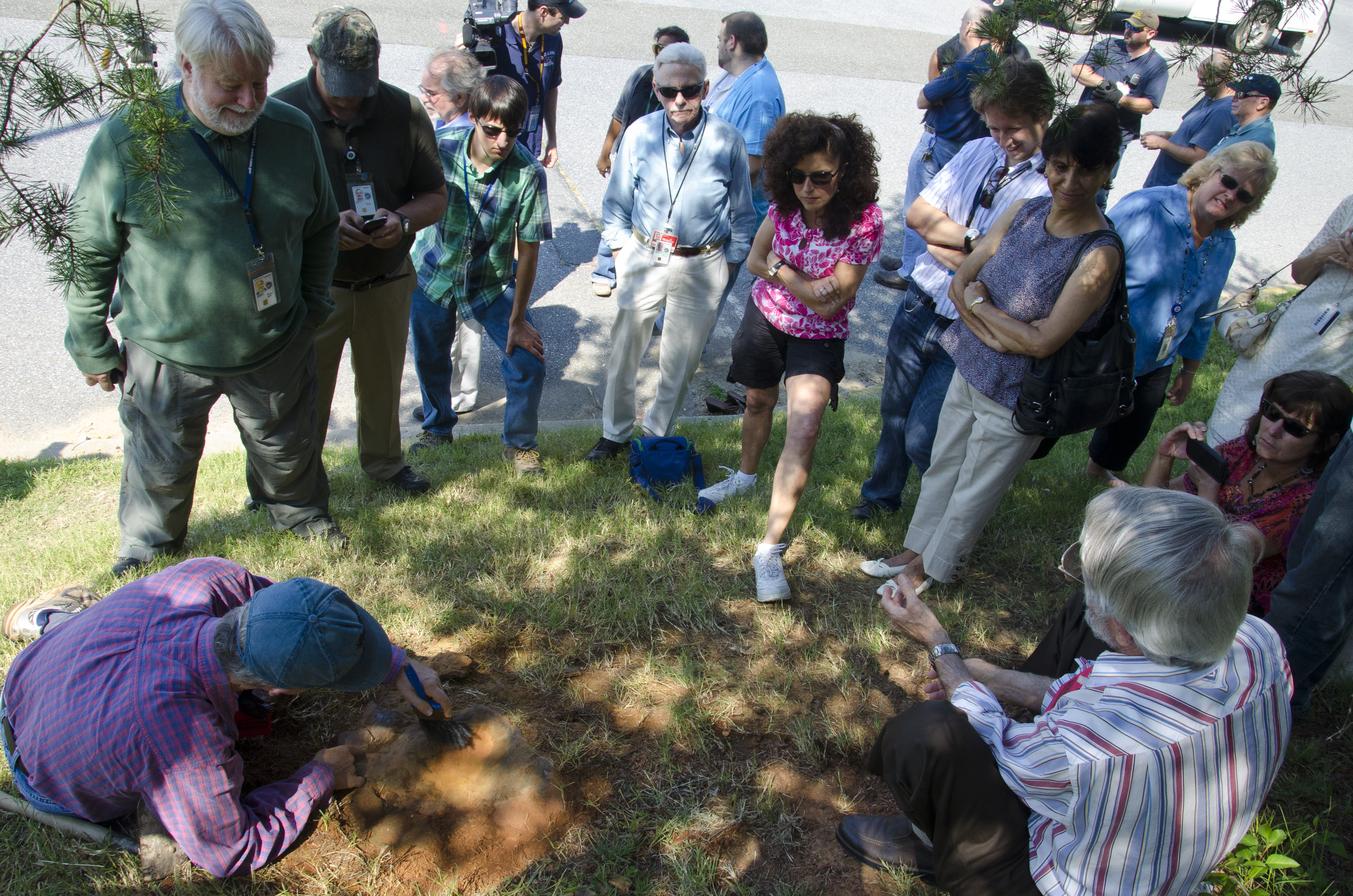 Dr. Robert Weems, emeritus paleontologist for the USGS verifies the recently discovered dinosaur track found on the NASA Goddard Space Flight Center campus. This imprint shows the right rear foot of a nodosaur - a low-slung, spiny leaf-eater - apparently moving in haste as the heel did not fully settle in the cretaceous mud, according to dinosaur tracker Ray Stanford. It was found recently on NASA's Goddard Space Flight Center campus and is being preserved for study. To read more about this discovery go to: <a href="http://1.usa.gov/P9NYg7" rel="nofollow">1.usa.gov/P9NYg7</a> Credit: NASA/GSFC/Rebecca Roth <b><a href="http://www.nasa.gov/audience/formedia/features/MP_Photo_Guidelines.html" rel="nofollow">NASA image use policy.</a></b> <b><a href="http://www.nasa.gov/centers/goddard/home/index.html" rel="nofollow">NASA Goddard Space Flight Center</a></b> enables NASA’s mission through four scientific endeavors: Earth Science, Heliophysics, Solar System Exploration, and Astrophysics. Goddard plays a leading role in NASA’s accomplishments by contributing compelling scientific knowledge to advance the Agency’s mission. <b>Follow us on <a href="http://twitter.com/NASA_GoddardPix" rel="nofollow">Twitter</a></b> <b>Like us on <a href="http://www.facebook.com/pages/Greenbelt-MD/NASA-Goddard/395013845897?ref=tsd" rel="nofollow">Facebook</a></b> <b>Find us on <a href="http://instagrid.me/nasagoddard/?vm=grid" rel="nofollow">Instagram</a></b>