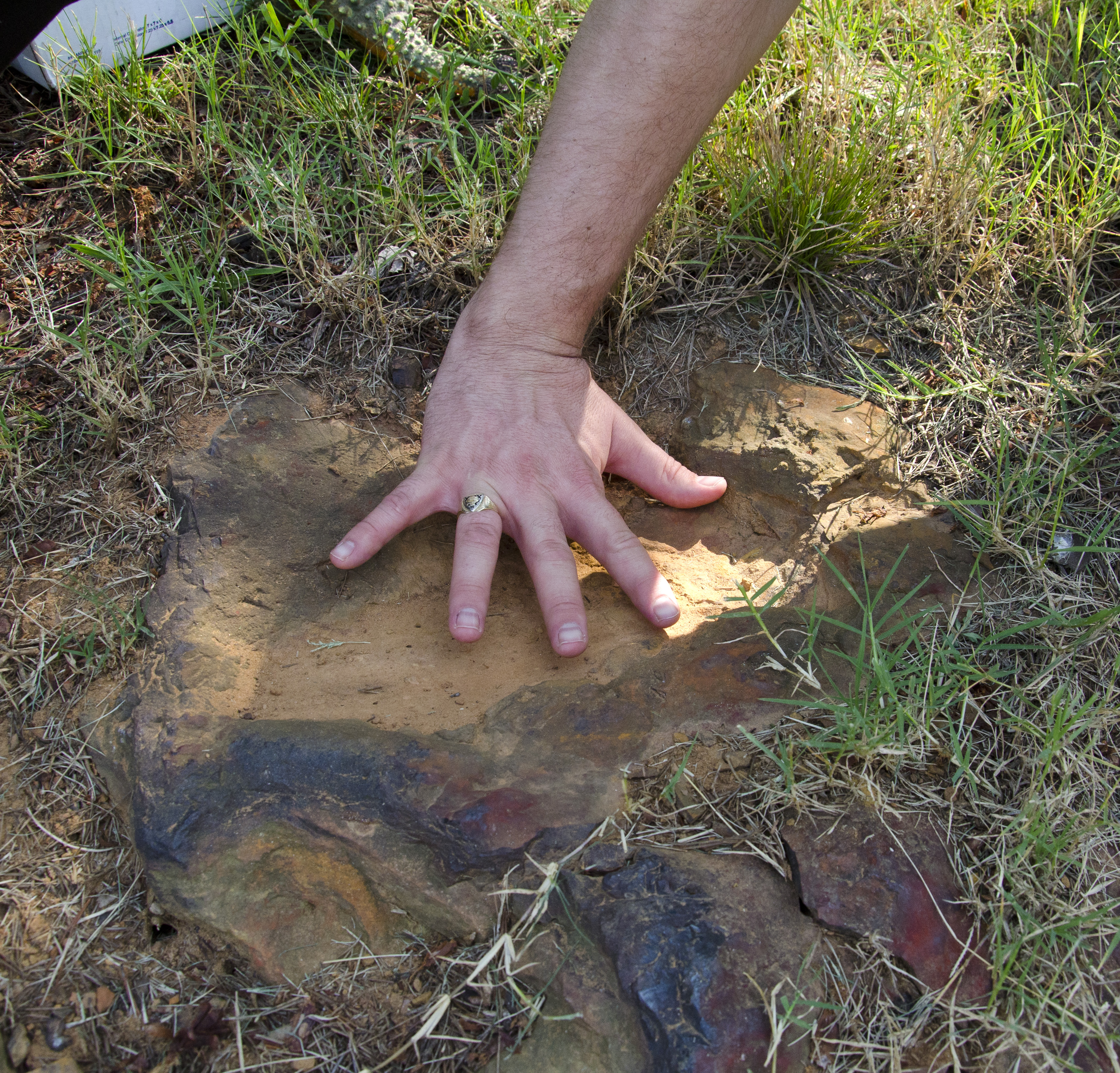 About 110 million light years away, the bright, barred spiral galaxy NGC3259 was just forming stars in dark bands of dust and gas. On Earth, a plant-eating dinosaur left footprints in the Cretaceous mud of what would later become the grounds of NASA’s Goddard Space Flight Center in Greenbelt, Md. Local dinosaur hunter Ray Stanford points out the impression to Goddard officials and members of local media. <b>To read more go to: <a href="http://www.nasa.gov/centers/goddard/news/features/2012/nodosaur.html" rel="nofollow">www.nasa.gov/centers/goddard/news/features/2012/nodosaur....</a></b> Credit: NASA/Goddard/Rebecca Roth <b><a href="http://www.nasa.gov/audience/formedia/features/MP_Photo_Guidelines.html" rel="nofollow">NASA image use policy.</a></b> <b><a href="http://www.nasa.gov/centers/goddard/home/index.html" rel="nofollow">NASA Goddard Space Flight Center</a></b> enables NASA’s mission through four scientific endeavors: Earth Science, Heliophysics, Solar System Exploration, and Astrophysics. Goddard plays a leading role in NASA’s accomplishments by contributing compelling scientific knowledge to advance the Agency’s mission. <b>Follow us on <a href="http://twitter.com/NASA_GoddardPix" rel="nofollow">Twitter</a></b> <b>Like us on <a href="http://www.facebook.com/pages/Greenbelt-MD/NASA-Goddard/395013845897?ref=tsd" rel="nofollow">Facebook</a></b> <b>Find us on <a href="http://instagrid.me/nasagoddard/?vm=grid" rel="nofollow">Instagram</a></b>