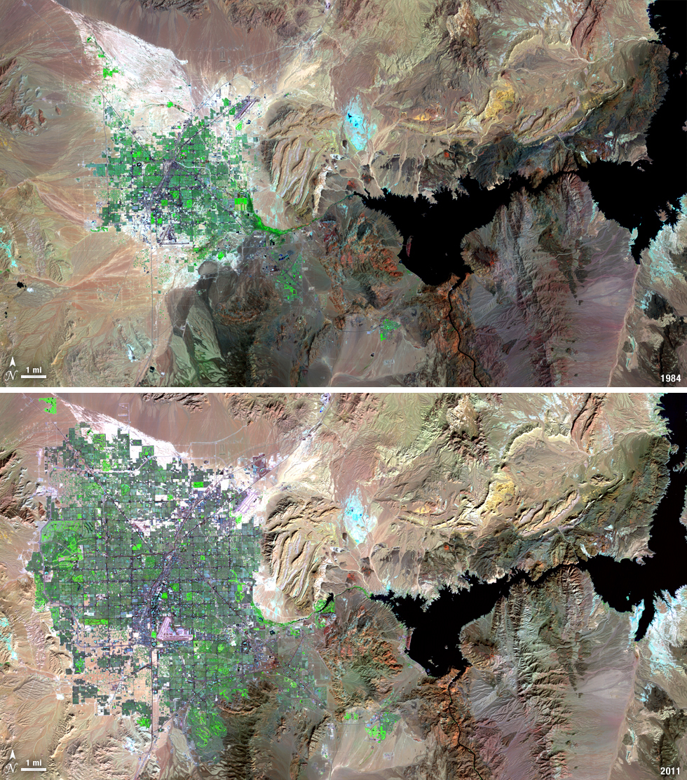 Over the years of the Landsat program, the desert city of Las Vegas has gone through a massive growth spurt. The outward expansion of the city over the last quarter of a century is shown here with two false-color Landsat 5 images (August 3, 1984, and November 2, 2011). The dark purple grid of city streets and the green of irrigated vegetation grow out in every direction into the surrounding desert. These images were created using reflected light from the shortwave infrared, near-infrared, and green portions of the electromagnetic spectrum (Landsat 5 TM bands 7,4,2). ---- NASA and the U.S. Department of the Interior through the U.S. Geological Survey (USGS) jointly manage Landsat, and the USGS preserves a 40-year archive of Landsat images that is freely available over the Internet. The next Landsat satellite, now known as the Landsat Data Continuity Mission (LDCM) and later to be called Landsat 8, is scheduled for launch in 2013. In honor of Landsat’s 40th anniversary in July 2012, the USGS released the LandsatLook viewer – a quick, simple way to go forward and backward in time, pulling images of anywhere in the world out of the Landsat archive. <b><a href="http://www.nasa.gov/audience/formedia/features/MP_Photo_Guidelines.html" rel="nofollow">NASA image use policy.</a></b> <b><a href="http://www.nasa.gov/centers/goddard/home/index.html" rel="nofollow">NASA Goddard Space Flight Center</a></b> enables NASA’s mission through four scientific endeavors: Earth Science, Heliophysics, Solar System Exploration, and Astrophysics. Goddard plays a leading role in NASA’s accomplishments by contributing compelling scientific knowledge to advance the Agency’s mission. <b>Follow us on <a href="http://twitter.com/NASA_GoddardPix" rel="nofollow">Twitter</a></b> <b>Like us on <a href="http://www.facebook.com/pages/Greenbelt-MD/NASA-Goddard/395013845897?ref=tsd" rel="nofollow">Facebook</a></b> <b>Find us on <a href="http://instagrid.me/nasagoddard/?vm=grid" rel="nofollow">Instagram</a></b>