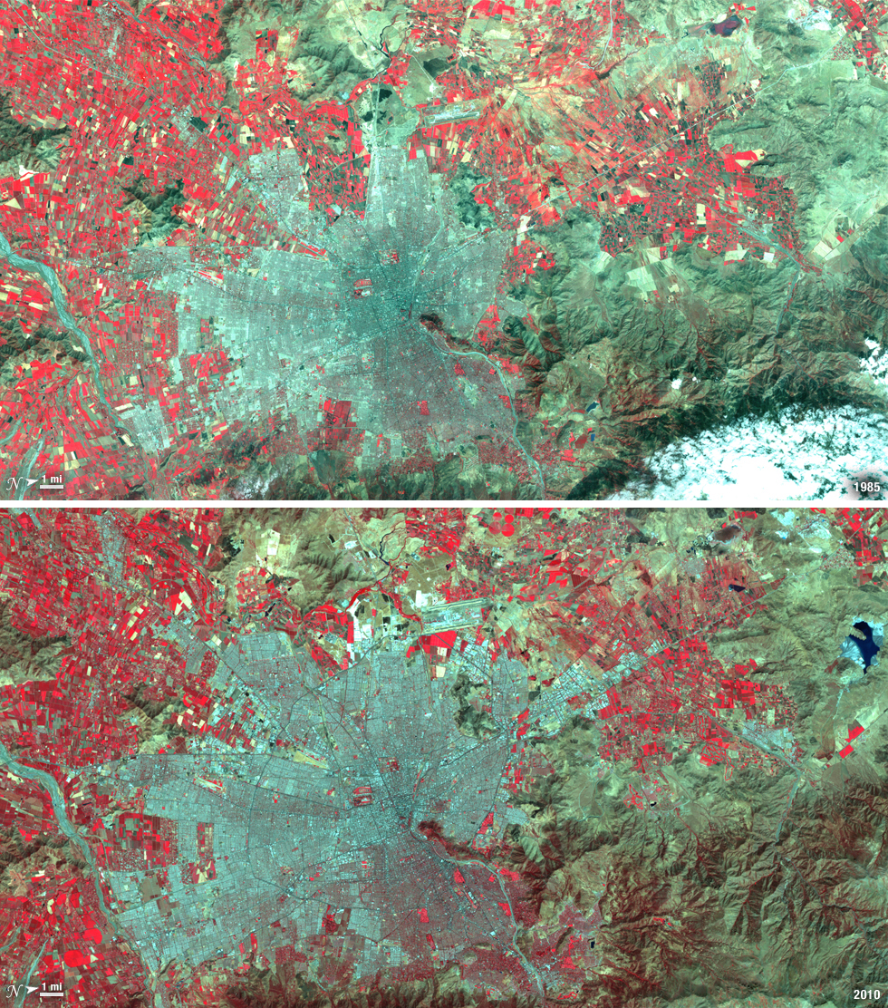 Santiago, Chile, ranks among the world's fastest growing cities. Chile is South America's fifth largest economy with strong export and tourism markets. More than a third of Chile's population lives in Santiago as of 2009. Taken on January 9, 1985, and January 30, 2010, this pair of images from the Landsat 5 satellite illustrates the city's steady growth. The images were made with infrared and visible light (Landsat bands 4, 3, and 2) so that plant-covered land is red. Bare or sparsely vegetated land is tan, and the city is dark silver. In the fifteen years that elapsed between 1985 and 2010, the city expanded away from the Andes Mountains along spoke-like lines, which are major roads. ---- NASA and the U.S. Department of the Interior through the U.S. Geological Survey (USGS) jointly manage Landsat, and the USGS preserves a 40-year archive of Landsat images that is freely available over the Internet. The next Landsat satellite, now known as the Landsat Data Continuity Mission (LDCM) and later to be called Landsat 8, is scheduled for launch in 2013. In honor of Landsat’s 40th anniversary in July 2012, the USGS released the LandsatLook viewer – a quick, simple way to go forward and backward in time, pulling images of anywhere in the world out of the Landsat archive. <b><a href="http://www.nasa.gov/audience/formedia/features/MP_Photo_Guidelines.html" rel="nofollow">NASA image use policy.</a></b> <b><a href="http://www.nasa.gov/centers/goddard/home/index.html" rel="nofollow">NASA Goddard Space Flight Center</a></b> enables NASA’s mission through four scientific endeavors: Earth Science, Heliophysics, Solar System Exploration, and Astrophysics. Goddard plays a leading role in NASA’s accomplishments by contributing compelling scientific knowledge to advance the Agency’s mission. <b>Follow us on <a href="http://twitter.com/NASA_GoddardPix" rel="nofollow">Twitter</a></b> <b>Like us on <a href="http://www.facebook.com/pages/Greenbelt-MD/NASA-Goddard/395013845897?ref=tsd" rel="nofollow">Facebook</a></b> <b>Find us on <a href="http://instagrid.me/nasagoddard/?vm=grid" rel="nofollow">Instagram</a></b>