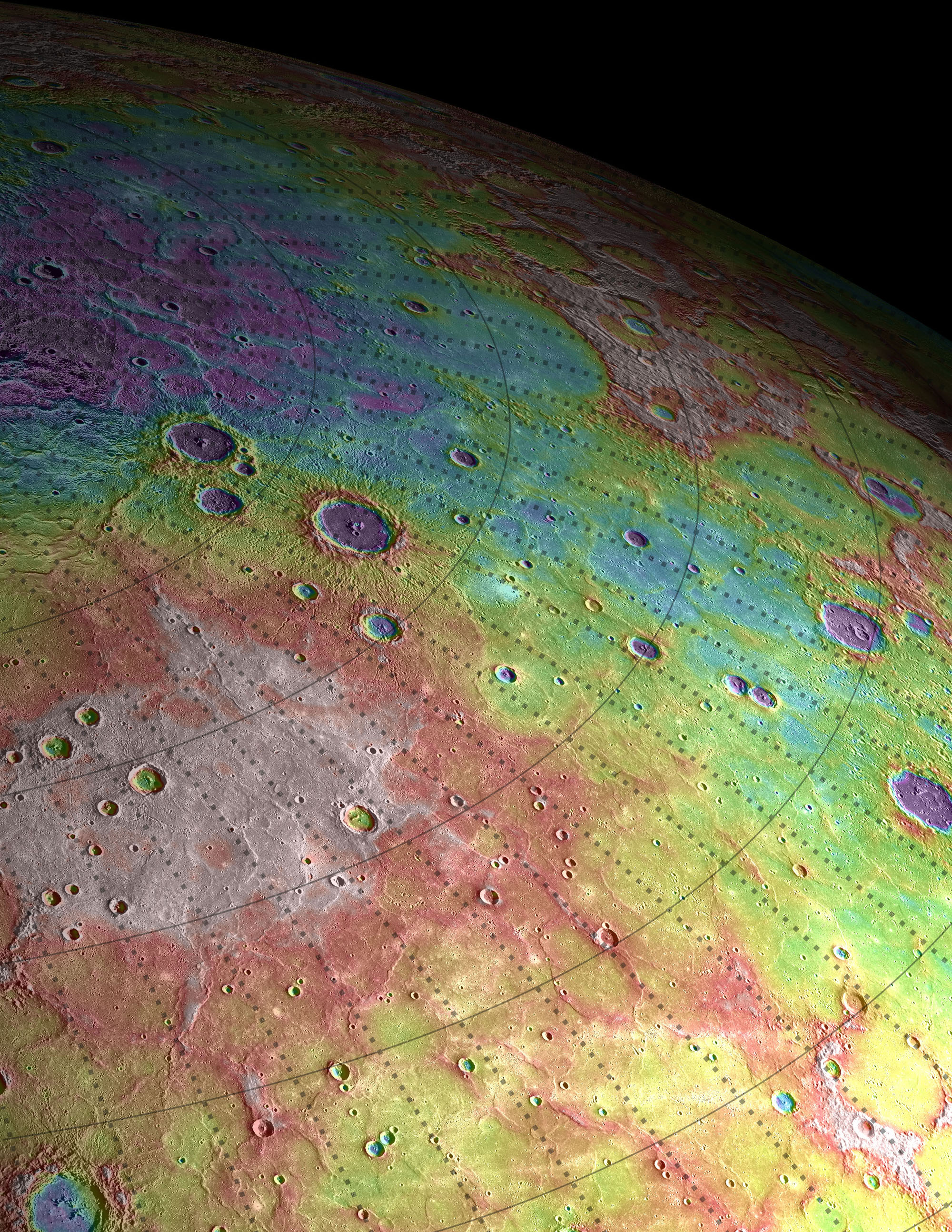 Scale: The width of this image is about 250 kilometers (150 miles) Topographic information from the Mercury Laser Altimeter (MLA) is used to colorize a image mosaic of Goethe basin, located in Mercury's northern region. The purple colors are low and white is the highest; the total range of heights shown in this view is about 1 kilometer. Goethe basin is home to a variety of interesting features, including ghost craters with graben, wrinkle ridges that outline the basin, and dark craters that host radar-bright materials. The MESSENGER spacecraft is the first ever to orbit the planet Mercury, and the spacecraft's seven scientific instruments and radio science investigation are unraveling the history and evolution of the Solar System's innermost planet. Visit the Why Mercury? section of this website to learn more about the key science questions that the MESSENGER mission is addressing. During the one-year primary mission, MDIS acquired 88,746 images and extensive other data sets. MESSENGER is now in a yearlong extended mission, during which plans call for the acquisition of more than 80,000 additional images to support MESSENGER’s science goals. Credit: NASA/Johns Hopkins University Applied Physics Laboratory/Carnegie Institution of Washington/Brown University <b><a href="http://www.nasa.gov/audience/formedia/features/MP_Photo_Guidelines.html" rel="nofollow">NASA image use policy.</a></b> <b><a href="http://www.nasa.gov/centers/goddard/home/index.html" rel="nofollow">NASA Goddard Space Flight Center</a></b> enables NASA’s mission through four scientific endeavors: Earth Science, Heliophysics, Solar System Exploration, and Astrophysics. Goddard plays a leading role in NASA’s accomplishments by contributing compelling scientific knowledge to advance the Agency’s mission. <b>Follow us on <a href="http://twitter.com/NASA_GoddardPix" rel="nofollow">Twitter</a></b> <b>Like us on <a href="http://www.facebook.com/pages/Greenbelt-MD/NASA-Goddard/395013845897?ref=tsd" rel="nofollow">Facebook</a></b> <b>Find us on <a href="http://instagrid.me/nasagoddard/?vm=grid" rel="nofollow">Instagram</a></b>
