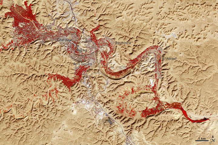 NASA image acquired Feb. 9, 2011 Less than 5 percent of Algeria’s land surface is suitable for growing crops, and most precipitation falls on the Atlas Mountains along the coast. Inland, dust-laden winds blow over rocky plains and sand seas. However, in north central Algeria—off the tip of Grand Erg Occidental and about 450 kilometers (280 miles) south of Algiers—lies a serpentine stretch of vegetation. It is the M’zab Valley, filled with palm groves and dotted with centuries-old settlements. The Advanced Spaceborne Thermal Emission and Reflection Radiometer (ASTER) on NASA’s Terra satellite captured this image of M’zab Valley on February 9, 2011. ASTER combines infrared, red, and green wavelengths of light. Bare rock ranges in color from beige to peach. Buildings and paved surfaces appear gray. Vegetation is red, and brighter shades of red indicate more robust vegetation. This oasis results from water that is otherwise in short supply in the Sahara Desert, thanks to the valley’s approximately 3,000 wells. Chemical analysis of Algerian aquifers, as well studies of topography in Algeria and Tunisia, suggest this region experienced a cooler climate in the late Pleistocene, and potentially heavy monsoon rains earlier in the Holocene. The M’zab region shows evidence of meandering rivers and pinnate drainage patterns. The vegetation lining M’zab Valley highlights this old river valley’s contours. Cool summer temperatures and monsoon rains had long since retreated from the region by eleventh century, but this valley nevertheless supported the establishment of multiple fortified settlements, or ksours. Between 1012 A.D. and 1350 A.D., locals established the ksours of El-Atteuf, Bounoura, Melika, Ghardaïa, and Beni-Isguen. Collectively these cities are now a United Nations Educational, Scientific, and Cultural Organization (UNESCO) World Heritage site. NASA Earth Observatory image by Robert Simmon and Jesse Allen, using data from the GSFC/METI/ERSDAC/JAROS, and U.S./Japan ASTER Science Team. Caption by Michon Scott. Instrument: Terra - ASTER <b>To download the full high res file go <a href="http://earthobservatory.nasa.gov/IOTD/view.php?id=51296" rel="nofollow"> here</a></b>