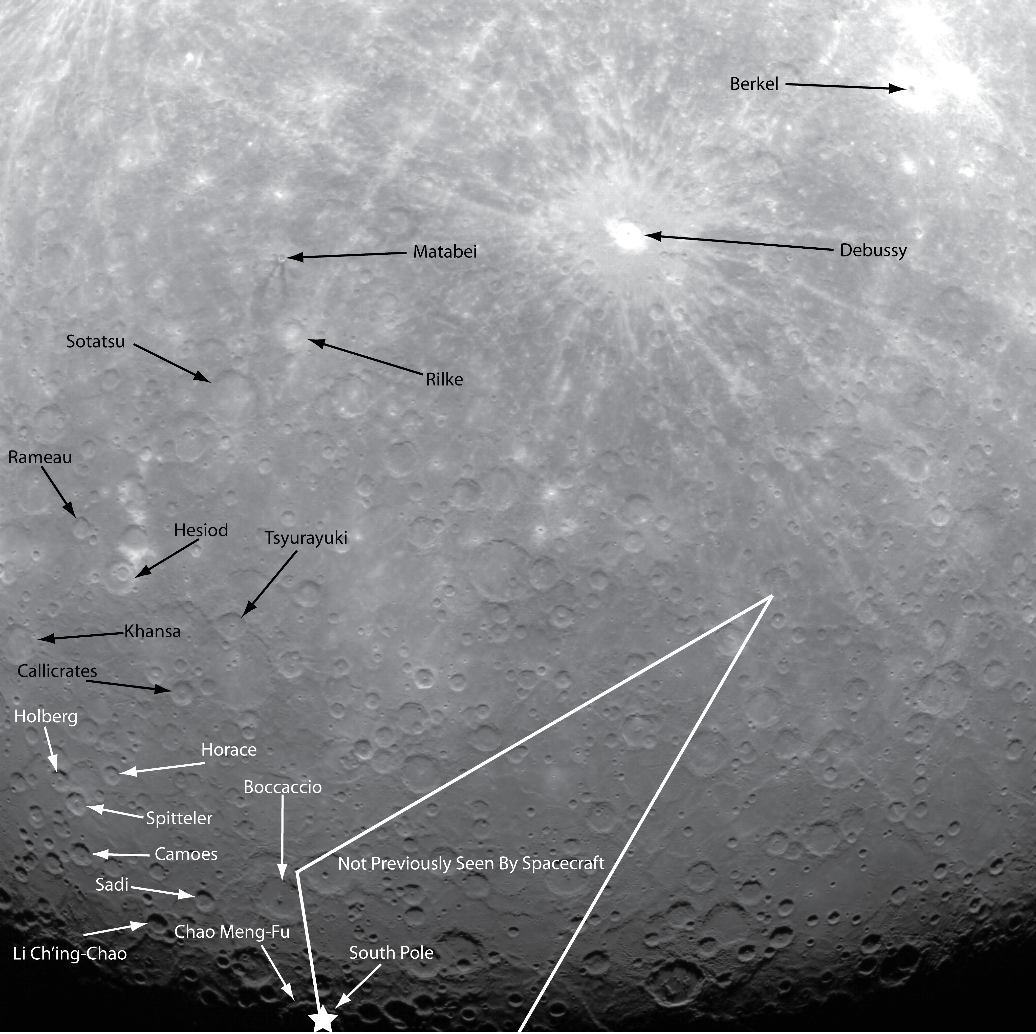 NASA image acquired: March 29, 2011 This historic first orbital image of Mercury was acquired 37 years to the day after Mariner 10’s historic first flyby of the innermost planet. Labels have been added to indicate several craters that were named based on Mariner 10 images, as well as Debussy, Matabei, and Berkel, which were named based on MESSENGER flyby images. The surface contained in the white lines is terrain previously unseen by spacecraft, and the star indicates the location of the south pole. On March 17, 2011 (March 18, 2011, UTC), MESSENGER became the first spacecraft to orbit the planet Mercury. The mission is currently in its commissioning phase, during which spacecraft and instrument performance are verified through a series of specially designed checkout activities. In the course of the one-year primary mission, the spacecraft's seven scientific instruments and radio science investigation will unravel the history and evolution of the Solar System's innermost planet. Visit the Why Mercury? section of this website to learn more about the science questions that the MESSENGER mission has set out to answer. Credit: NASA/Johns Hopkins University Applied Physics Laboratory/Carnegie Institution of Washington <b><a href="http://www.nasa.gov/centers/goddard/home/index.html" rel="nofollow">NASA Goddard Space Flight Center</a></b> enables NASA’s mission through four scientific endeavors: Earth Science, Heliophysics, Solar System Exploration, and Astrophysics. Goddard plays a leading role in NASA’s accomplishments by contributing compelling scientific knowledge to advance the Agency’s mission. <b>Follow us on <a href="http://twitter.com/NASA_GoddardPix" rel="nofollow">Twitter</a></b> <b>Join us on <a href="http://www.facebook.com/pages/Greenbelt-MD/NASA-Goddard/395013845897?ref=tsd" rel="nofollow">Facebook</a></b>