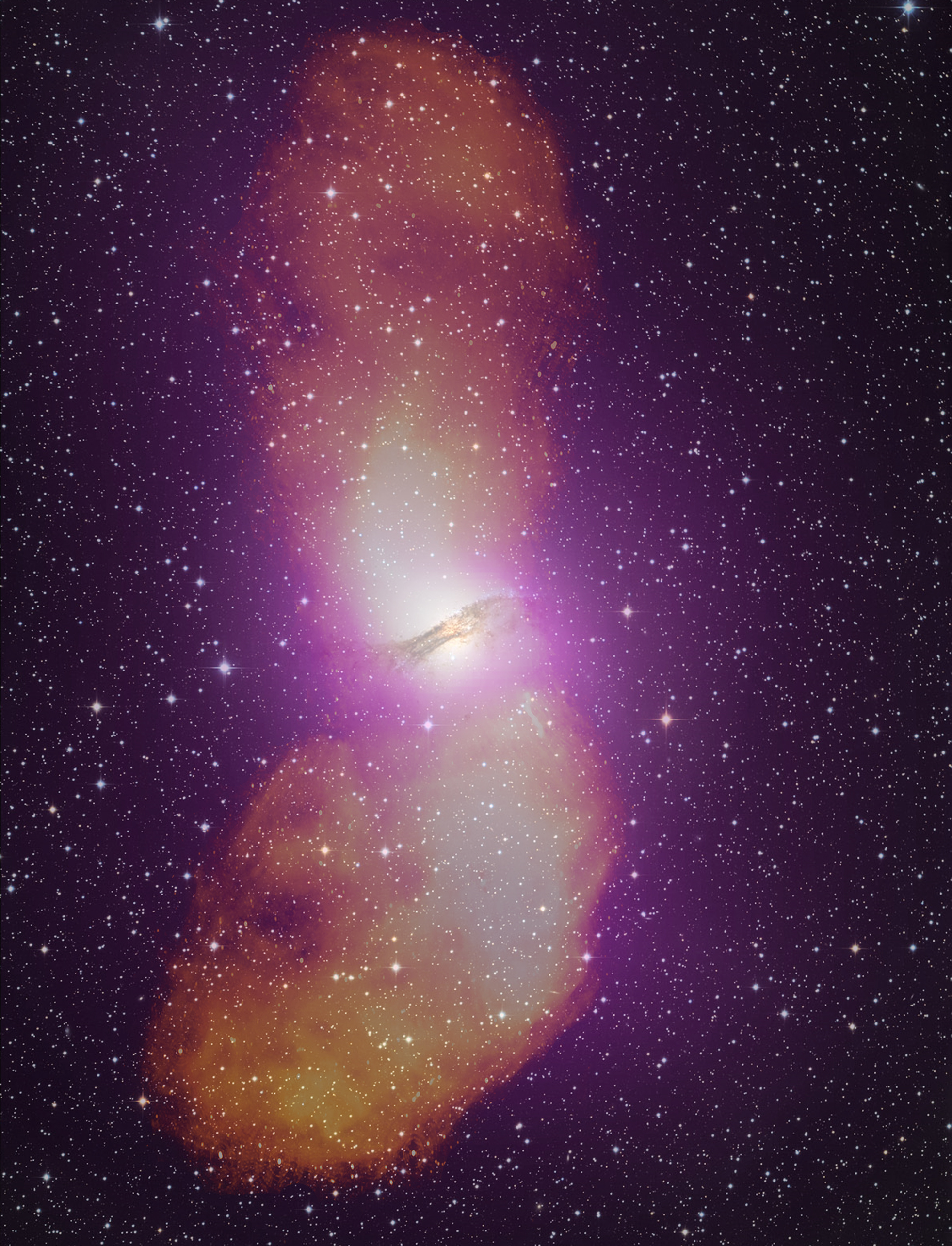 NASA release April 1, 2010 It takes the addition of radio data (orange) to fully appreciate the scale of Cen A's giant radio-emitting lobes, which stretch more than 1.4 million light-years. Gamma-rays from Fermi's Large Area Telescope (purple) and an image of the galaxy in visible light are also included in this composite. Credit: NASA/DOE/Fermi LAT Collaboration, Capella Observatory, and Ilana Feain, Tim Cornwell, and Ron Ekers (CSIRO/ATNF), R. Morganti (ASTRON), and N. Junkes (MPIfR) To learn more about these images go to: <a href="http://www.nasa.gov/mission_pages/GLAST/news/smokestack-plumes.html" rel="nofollow">www.nasa.gov/mission_pages/GLAST/news/smokestack-plumes.html</a> <b><a href="http://www.nasa.gov/centers/goddard/home/index.html" rel="nofollow">NASA Goddard Space Flight Center</a></b> is home to the nation's largest organization of combined scientists, engineers and technologists that build spacecraft, instruments and new technology to study the Earth, the sun, our solar system, and the universe.