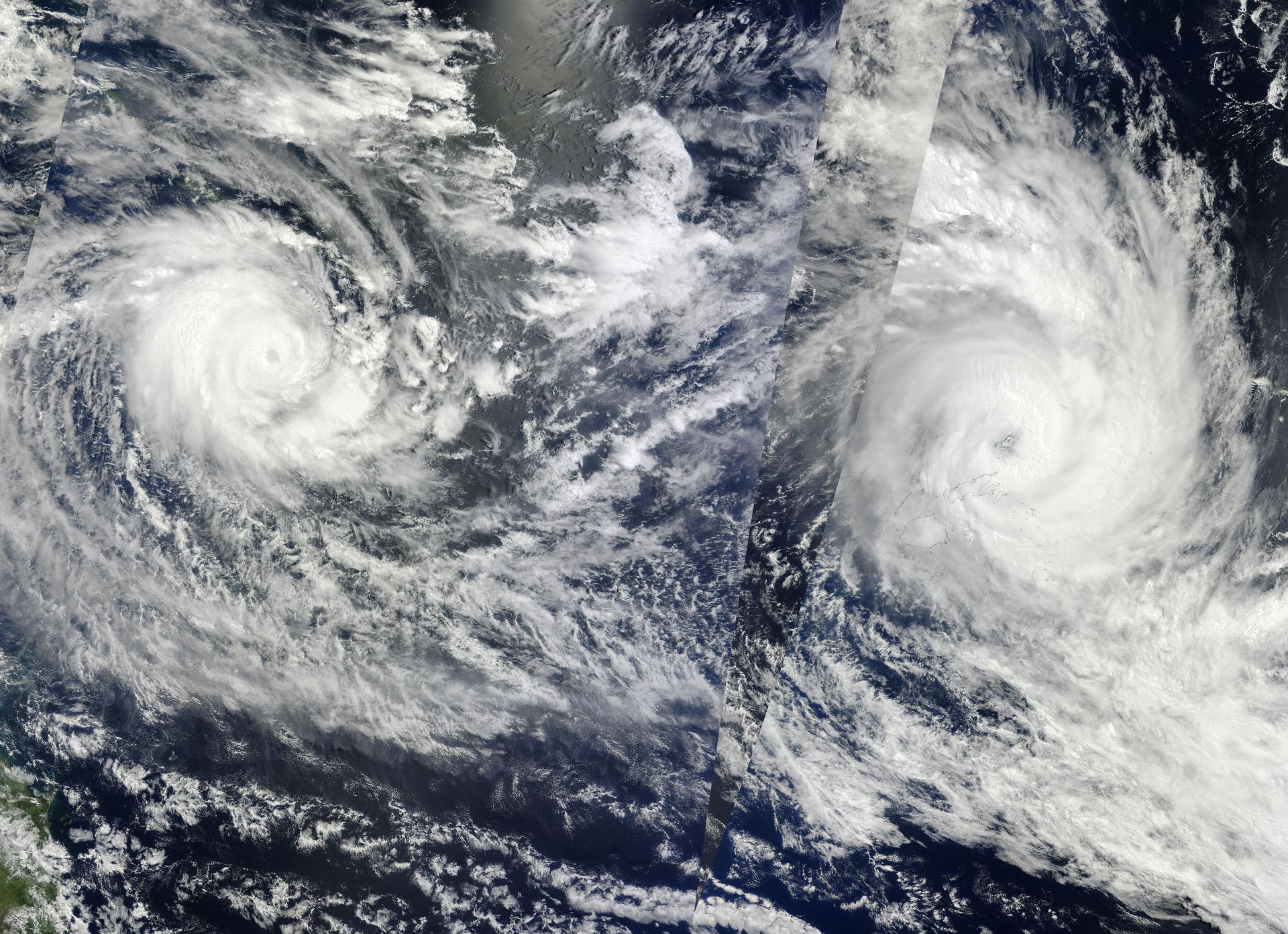 NASA Image acquired March 14 - 15, 2010 Two fierce tropical cyclones raged over the South Pacific Ocean in mid-March 2010, the U.S. Navy’s Joint Typhoon Warning Center (JTWC) reported. Over the Solomon Islands, Tropical Cyclone Ului had maximum sustained winds of 130 knots (240 kilometers per hour, 150 miles per hour) and gusts up to 160 knots (300 km/hr, 180 mph). Over Fiji, Tropical Cyclone Tomas had maximum sustained winds of 115 knots (215 km/hr, 132 mph) and gusts up to 140 knots (260 km/hr, 160 mph). The Moderate Resolution Imaging Spectroradiometer (MODIS) on NASA’s Terra and Aqua satellites captured both storms in multiple passes over the South Pacific on March 15, 2010, local time. The majority of the image is from the morning of March 15 (late March 14, UTC time) as seen by MODIS on the Terra satellite, with the right portion of the image having been acquired earliest. The wedge-shaped area right of center is from Aqua MODIS, and it was taken in the early afternoon of March 15 (local time). Although it packs less powerful winds, according to the JTWC, Tomas stretches across a larger area. It was moving over the northern Fiji islands when Terra MODIS captured the right portion of the image. According to early reports, Tomas forced more than 5,000 people from their homes while the islands sustained damage to crops and buildings. The JTWC reported that Tomas had traveled slowly toward the south and was passing over an area of high sea surface temperatures. (Warm seas provide energy for cyclones.) This storm was expected to intensify before transitioning to an extratropical storm. Ului is more compact and more powerful. A few hours before this image was taken, the storm had been an extremely dangerous Category 5 cyclone with sustained winds of 140 knots (260 km/hr, 160 mph). Ului degraded slightly before dealing the southern Solomon Islands a glancing blow. Initial news reports say that homes were damaged on the islands, but no one was injured. Like Tomas, Ului had been moving westward over an area of high sea surface temperatures. This storm was expected to continue moving westward before turning south and eventually weakening. The high-resolution image provided above is at 500 meters per pixel. The MODIS Rapid Response System provides this image at additional resolutions. NASA image by Jeff Schmaltz, MODIS Rapid Response Team, Goddard Space Flight Center. Caption by Michon Scott and Holli Riebeek. Instrument: Terra - MODIS To learn more about this image go here: <a href="http://earthobservatory.nasa.gov/IOTD/view.php?id=43154." rel="nofollow">earthobservatory.nasa.gov/IOTD/view.php?id=43154.</a>.