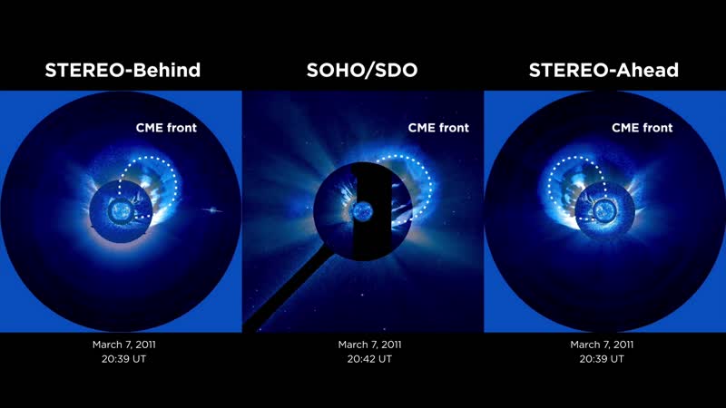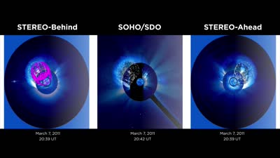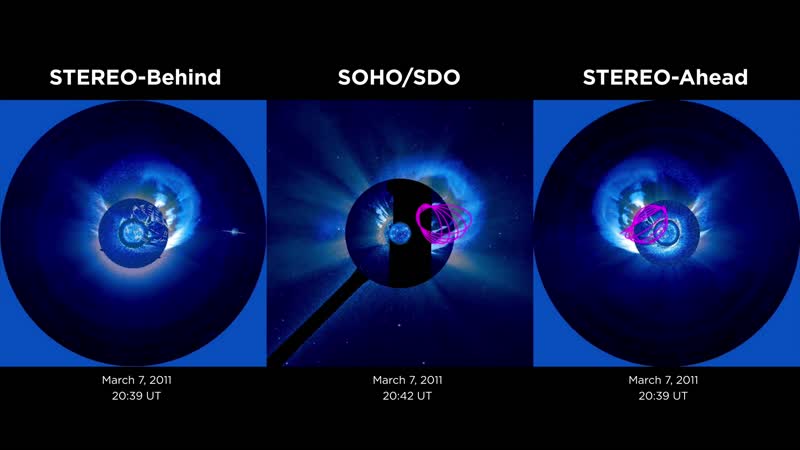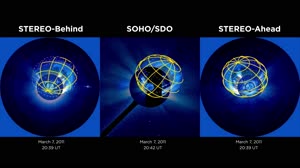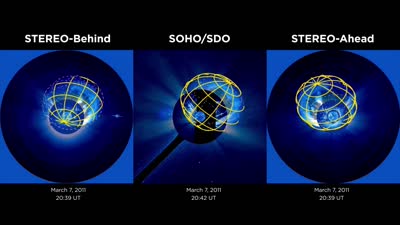 Using data from three different satellites, scientists have developed new models that recreate, in 3-D, CMEs and shocks, separately. This movie illustrates the recreation of a CME and shock that erupted from the Sun on March 7, 2011. The pink lines show the CME structure and the yellow lines show the structure of the shock - a side effect of the CME that can spark space weather events around Earth.