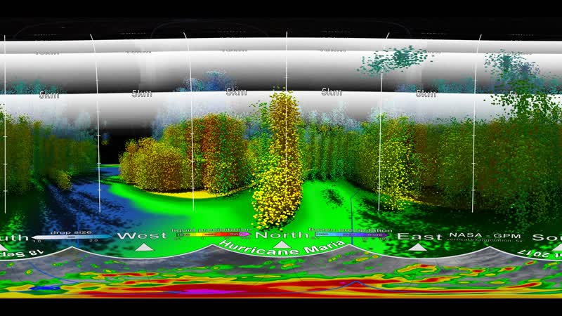 Two days before Hurricane Maria devastated Puerto Rico, the NASA-Japan Global Precipitation Measurement Core Observatory satellite captured a 3-D view of the storm. At the time Maria was a Category 1 hurricane. The 3-D view reveals the processes inside the hurricane that would fuel the storm’s intensification to a category 5 within 24 hours. For the first time in 360-degrees, this data visualization takes you inside the hurricane. The precipitation satellite has an advanced radar that measures both liquid and frozen water. The brightly colored dots show areas of rainfall, where green and yellow show low rates and red and purple show high rates. At the top of the hurricane, where temperatures are colder, blue and purple dots show light and heavy frozen precipitation. The colored areas below the dots show how much rain is falling at the surface. Created by: NASA's Scientific Visualization Studio and NASA's Goddard Space Flight Center Data Sources: • NASA/GPM Dual Precipitation Radar (DPR) precipitation rate and drop size distribution data • NASA/GPM GPM Microwave Imager (GMI) ground precipitation data • NASA/Bluemarble land imagery • NOAA/GOES16 cloud data • Hipparcos/Telescope/Tycho 2 Catalogue