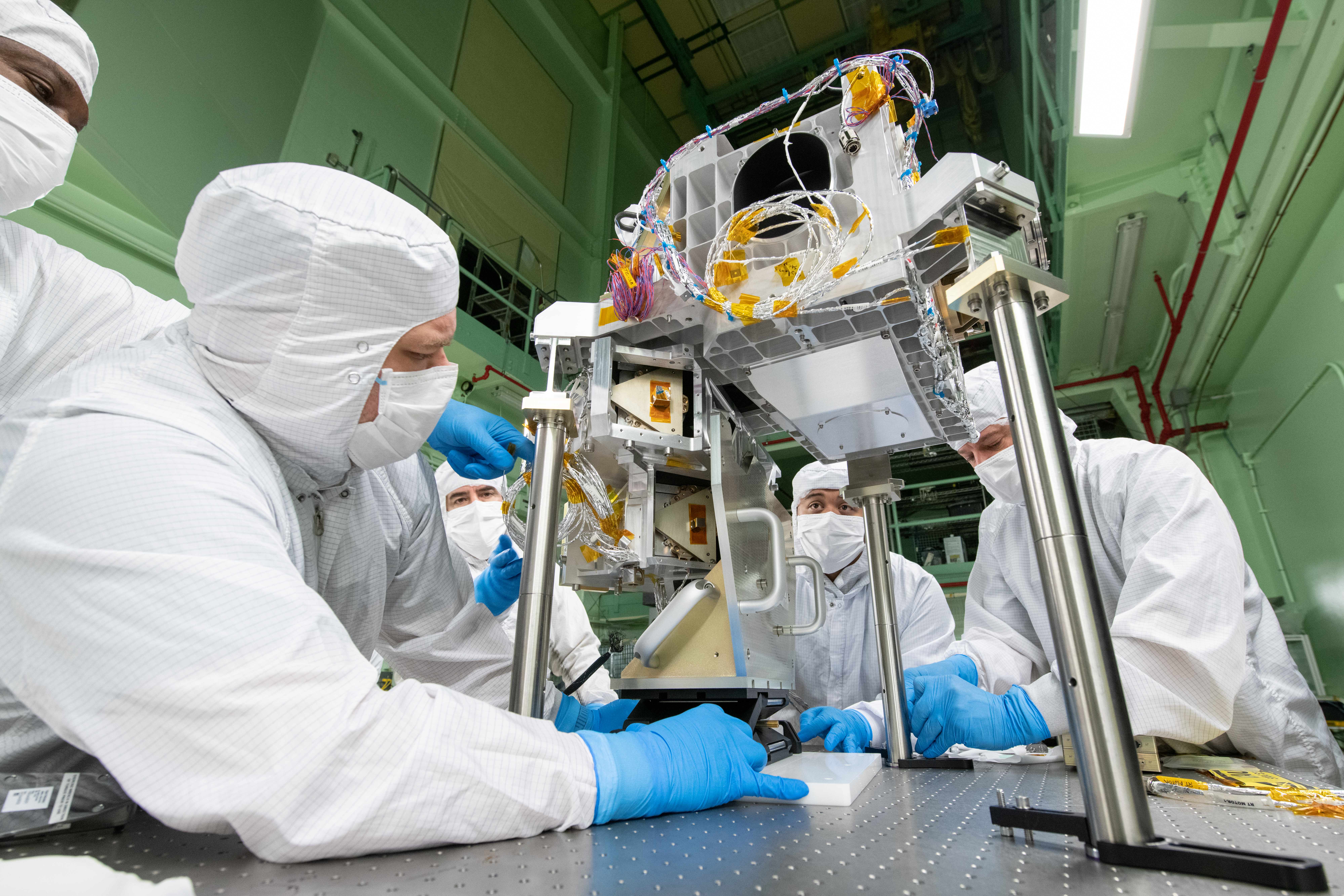 Mechanical technician, Andrew Scharmann, slides a lift fixture into position to ensure the Ocean Color Instrument (OCI) Main Optics Bench (MOB) and Main Optics Sub Bench (MOSB) are aligned. OCI is a highly advanced optical spectrometer that will be used to measure properties of light over portions of the electromagnetic spectrum. It will enable continuous measurement of light at finer wavelength resolution than previous NASA satellite sensors, extending key system ocean color data records for climate studies. OCI is PACE's (Plankton, Aerosol, Cloud, ocean Ecosystem) primary sensor built at Goddard Space Flight Center in Greenbelt, MD.