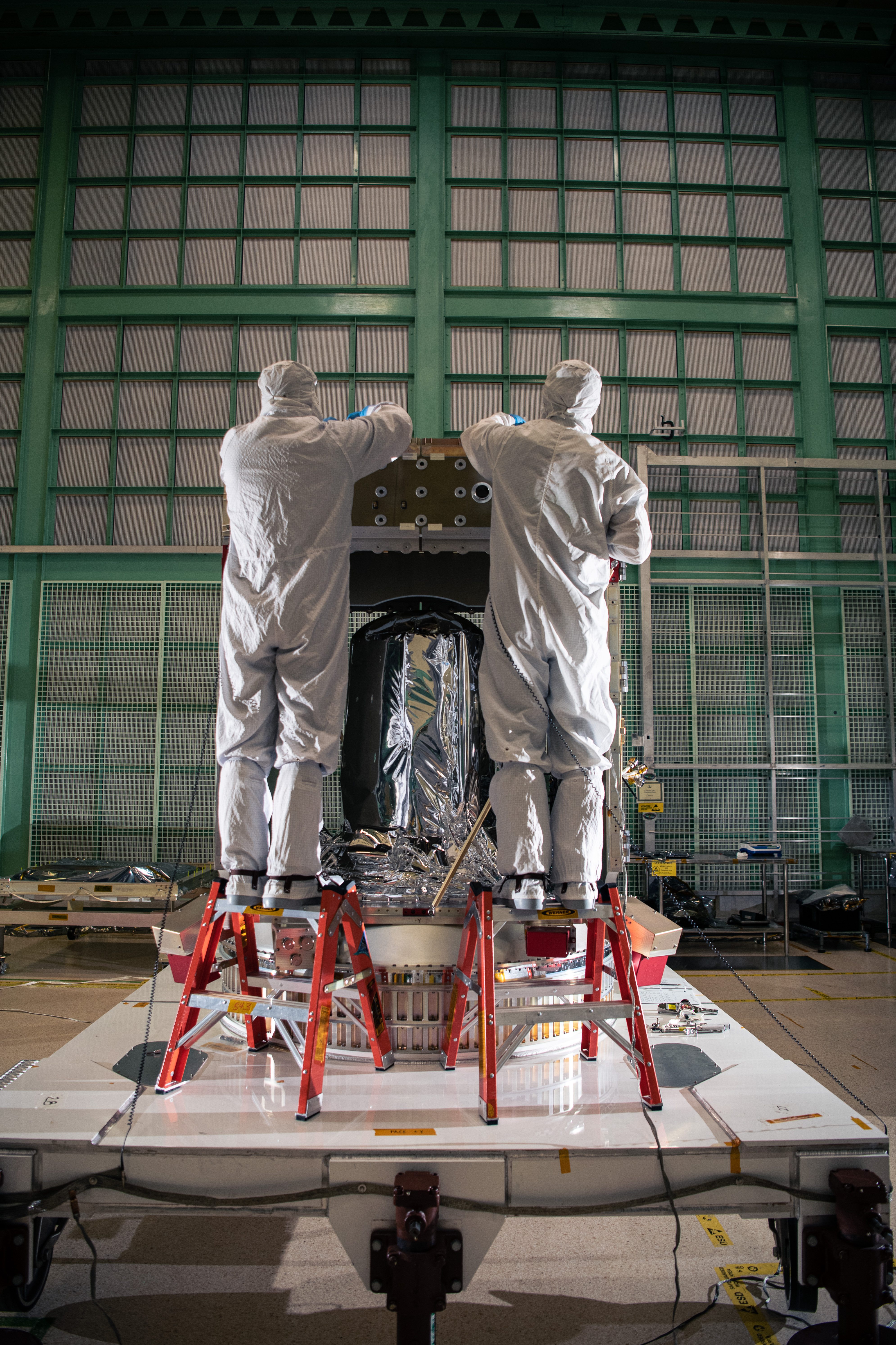 Engineering Technicians Alex Schaeffer and Eric Norris assemble the Plankton, Aerosol, Cloud, ocean Ecosystem (PACE) Spacecraft structure in the cleanroom at NASA Goddard Space Flight Center in Greenbelt, Maryland on February 24th, 2022. PACE's unprecedented spectral coverage will provide the first-ever global measurements designed to identify phytoplankton community composition. The mission will make global ocean color measurements, using the Ocean Color Instrument (OCI), to provide extended data records on ocean ecology and global biogeochemistry along with polarimetry measurements, using the Spectro-polarimeter for Planetary Exploration (SPEXone) and the Hyper Angular Research Polarimeter (HARP2) to provide extended data records on clouds and aerosols. The Earth-observing satellite mission, built at Goddard Space Flight Center in Greenbelt, MD, will continue and advance observations of global ocean color, biogeochemistry, and ecology, as well as the carbon cycle, aerosols and clouds.