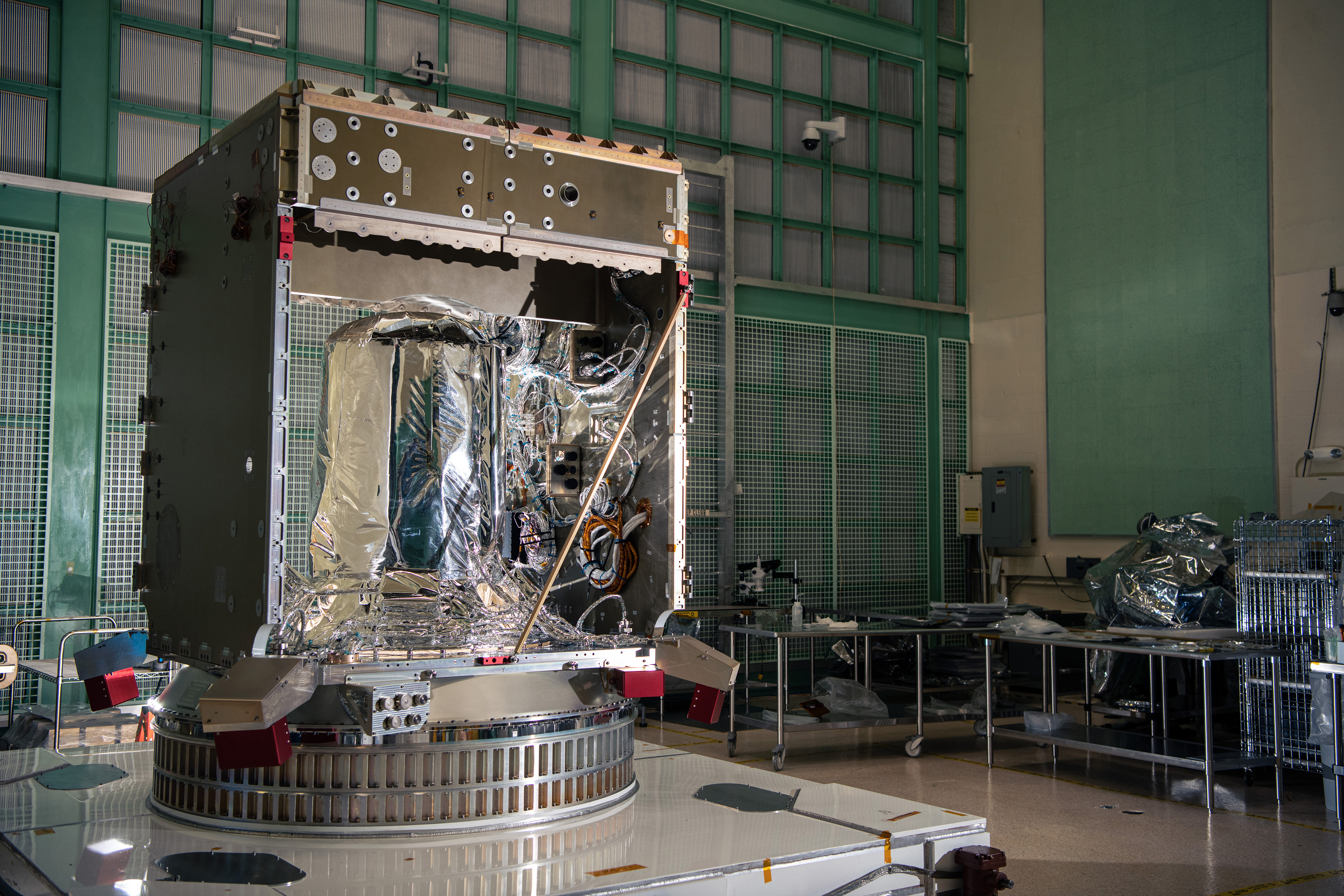 The flight propellant tank is visible inside the partially assembled Plankton, Aerosol, Cloud, ocean Ecosystem (PACE) Spacecraft structure in the cleanroom at NASA Goddard Space Flight Center in Greenbelt, Maryland on February 24th, 2022. PACE's unprecedented spectral coverage will provide the first-ever global measurements designed to identify phytoplankton community composition. The mission will make global ocean color measurements, using the Ocean Color Instrument (OCI), to provide extended data records on ocean ecology and global biogeochemistry along with polarimetry measurements, using the Spectro-polarimeter for Planetary Exploration (SPEXone) and the Hyper Angular Research Polarimeter (HARP2) to provide extended data records on clouds and aerosols. The Earth-observing satellite mission, built at Goddard Space Flight Center in Greenbelt, MD, will continue and advance observations of global ocean color, biogeochemistry, and ecology, as well as the carbon cycle, aerosols and clouds.