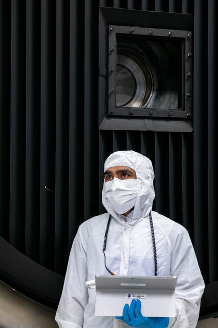Thermal Engineer, Deepak Patel, reviews test plans and inspects the Ocean Color Instrument (OCI) in the thermal vacuum chamber prior to the door for the instruments sixty day thermal test to ensure it will perform effectively once it launches into the airless environment of space. OCI is a highly advanced optical spectrometer that will be used to measure properties of light over portions of the electromagnetic spectrum. It will enable continuous measurement of light at finer wavelength resolution than previous NASA satellite sensors, extending key system ocean color data records for climate studies. OCI is PACE's (Plankton, Aerosol, Cloud, ocean Ecosystem) primary sensor built at Goddard Space Flight Center in Greenbelt, MD.