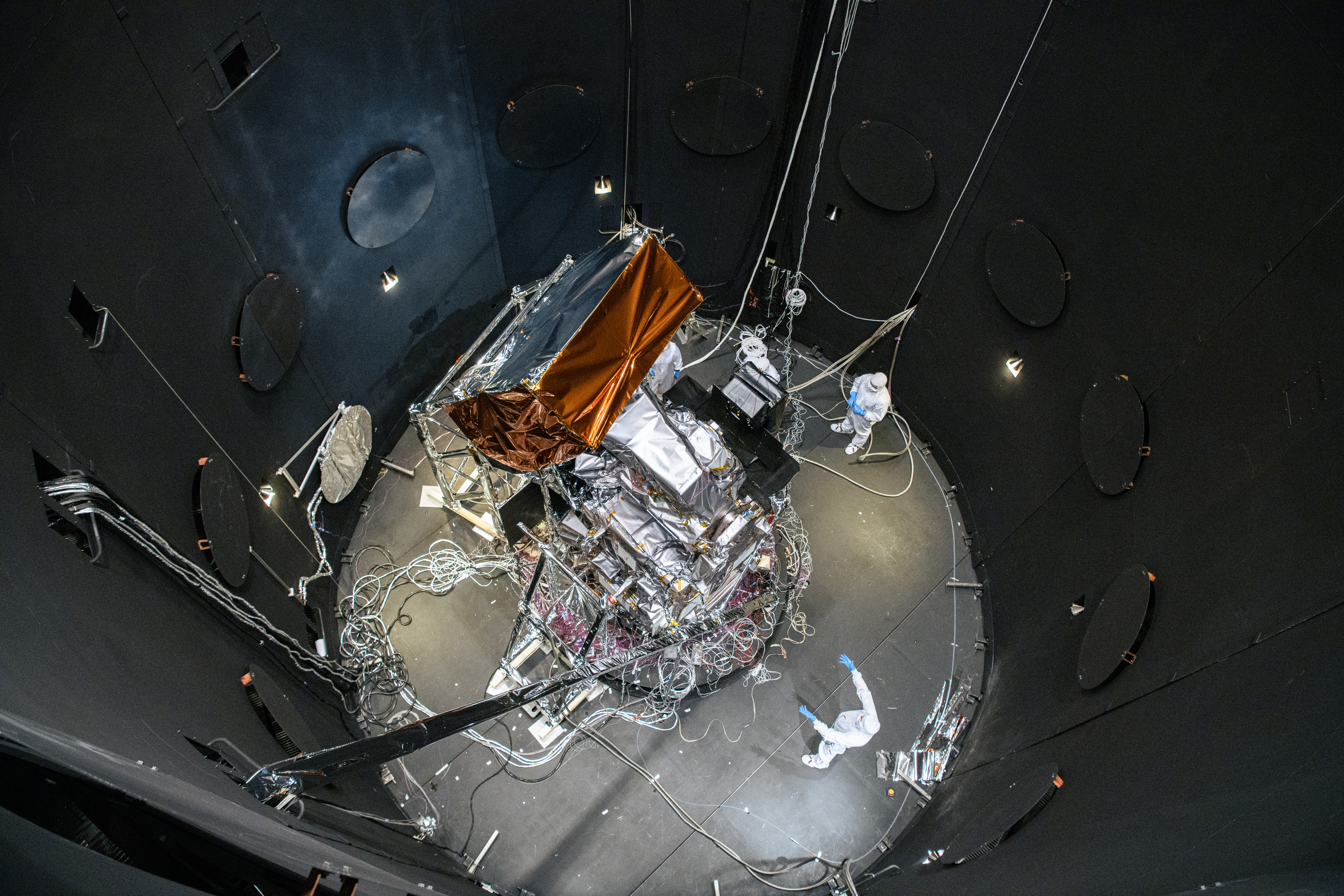 The Plankton, Aerosol, Cloud, ocean Ecosystem (PACE) Observatory inside the Space Environment Simulator (SES) thermal vacuuum chamber before thermal environmental testing at NASA's Goddard Space Flight Center in Greenbelt, Maryland on June 16th, 2023. PACE's unprecedented spectral coverage will provide the first-ever global measurements designed to identify phytoplankton community composition. The mission will make global ocean color measurements, using the Ocean Color Instrument (OCI), to provide extended data records on ocean ecology and global biogeochemistry along with polarimetry measurements, using the Spectro-polarimeter for Planetary Exploration (SPEXone) and the Hyper Angular Research Polarimeter (HARP2) to provide extended data records on clouds and aerosols. The Earth-observing satellite mission, built at Goddard Space Flight Center in Greenbelt, MD, will continue and advance observations of global ocean color, biogeochemistry, and ecology, as well as the carbon cycle, aerosols and clouds.