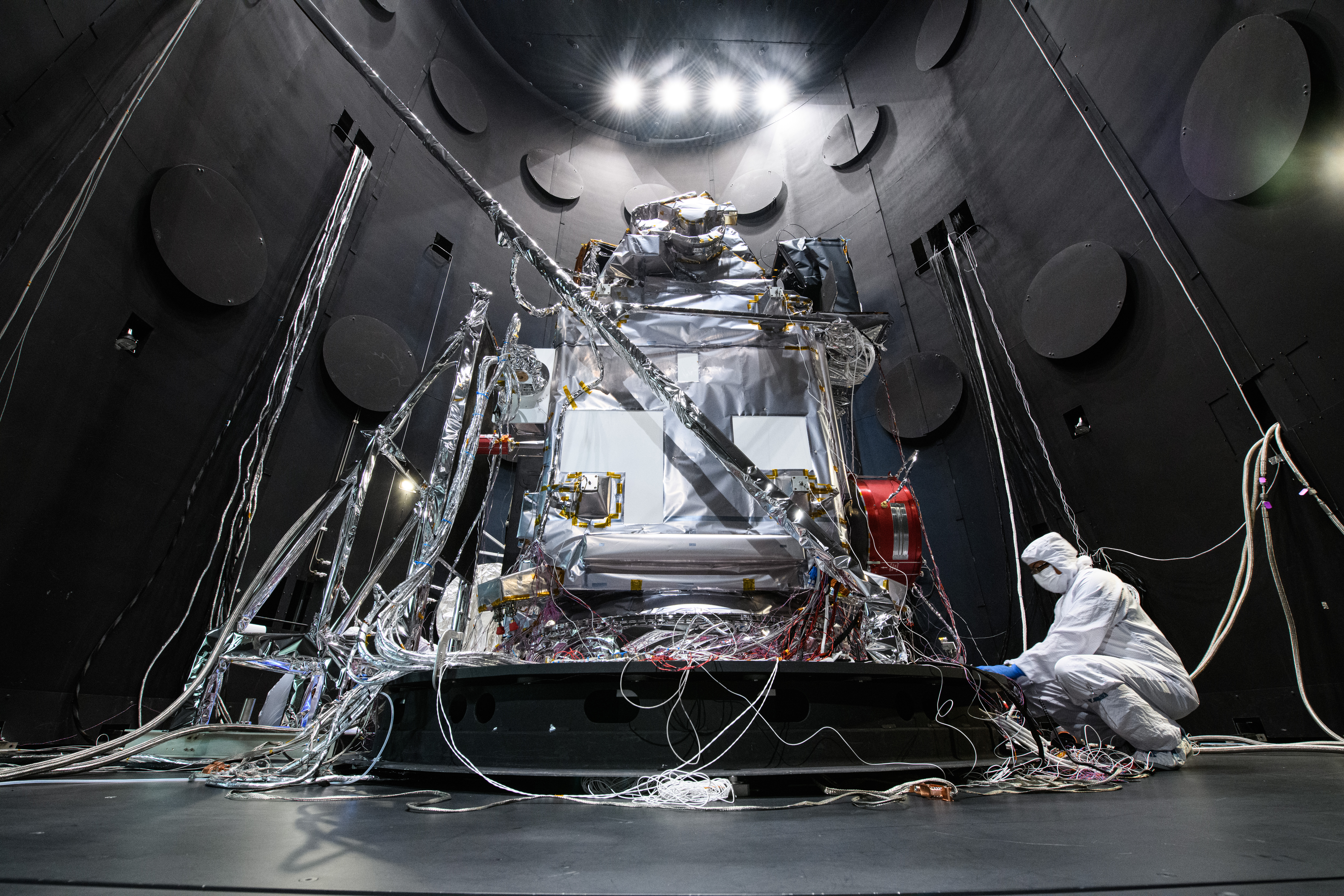 The Plankton, Aerosol, Cloud, ocean Ecosystem (PACE) Observatory inside the Space Environment Simulator (SES) thermal vacuuum chamber before thermal environmental testing at NASA's Goddard Space Flight Center in Greenbelt, Maryland on June 16th, 2023. PACE's unprecedented spectral coverage will provide the first-ever global measurements designed to identify phytoplankton community composition. The mission will make global ocean color measurements, using the Ocean Color Instrument (OCI), to provide extended data records on ocean ecology and global biogeochemistry along with polarimetry measurements, using the Spectro-polarimeter for Planetary Exploration (SPEXone) and the Hyper Angular Research Polarimeter (HARP2) to provide extended data records on clouds and aerosols. The Earth-observing satellite mission, built at Goddard Space Flight Center in Greenbelt, MD, will continue and advance observations of global ocean color, biogeochemistry, and ecology, as well as the carbon cycle, aerosols and clouds.