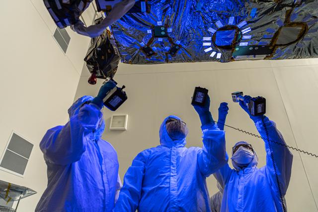 NASA Contamination and control engineers perform a blacklight inspection on the OSAM-1 Spacecraft Bus at Goddard Space Flight Center, Greenbelt Md., Sept 30, 2023. This photo has been reviewed by OSAM1 project management, Maxar public release authority, and the Export Control Office and is released for public view. NASA/Mike Guinto