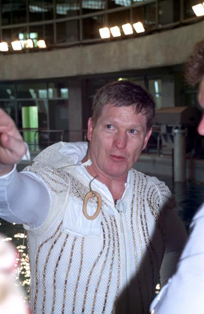 JSC2000-05375 (7 June 2000) --- Astronaut William Shepherd, mission commander for ISS Expedition One, is about to don his Orlan space suit in order to participate in an underwater spacewalk simulation in the Hydrolab facility at the Gagarin Cosmonaut Training Center in Russia.