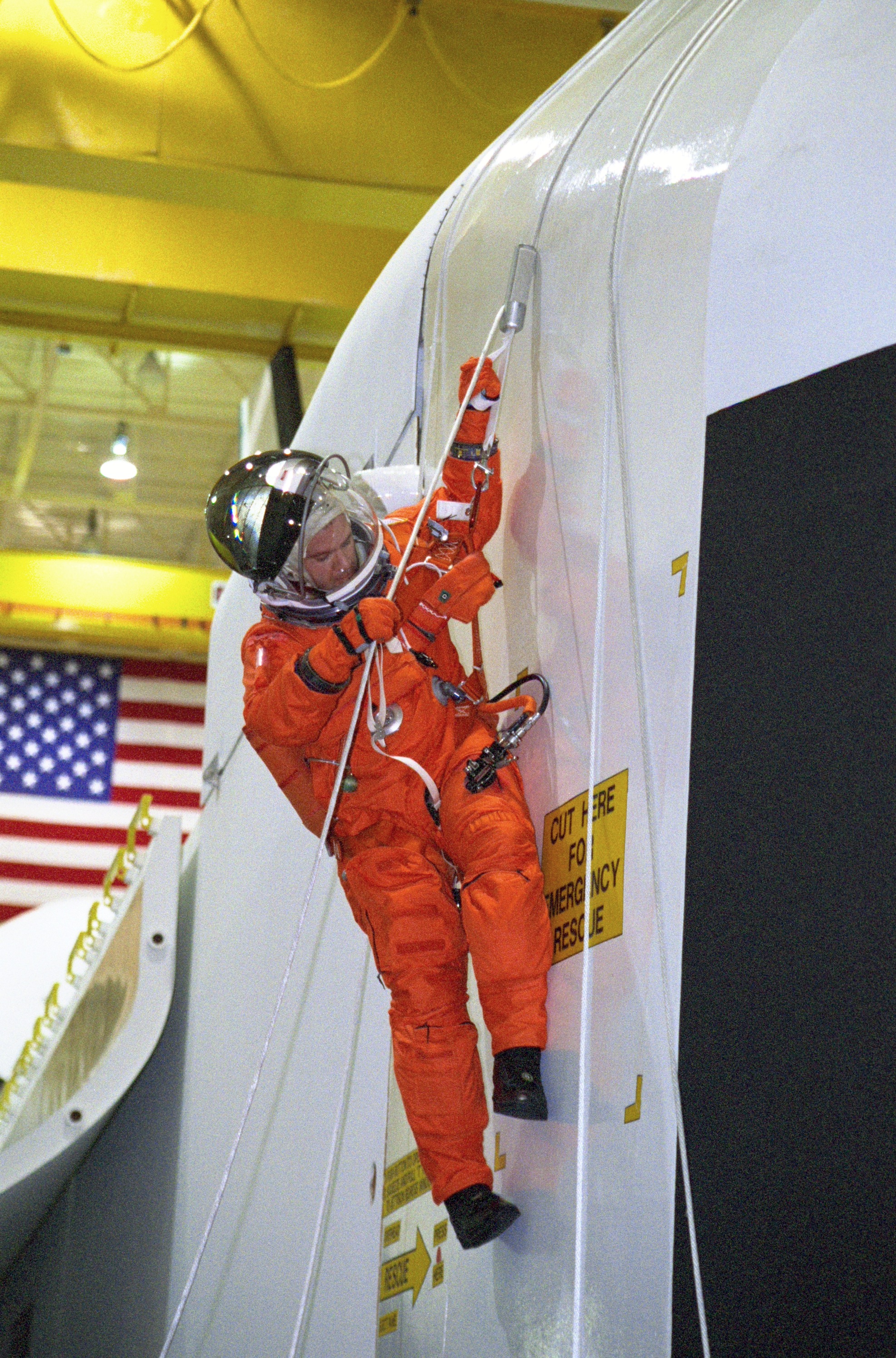 JSC2000-05553 (3 August 2000) --- Astronaut Paul W. Richards, STS-102 mission specialist, during a session of egress training in the Johnson Space Center's Systems Integration Facility, uses a Sky-genie device to escape from a simulated shuttle in trouble. The full fuselage trainer (FFT) is a full scale mockup of a shuttle.