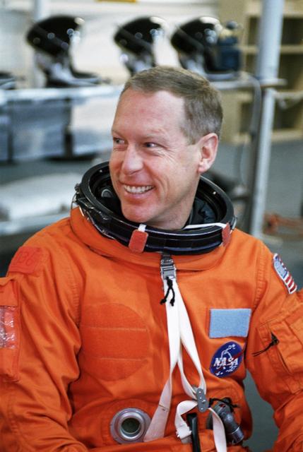JSC2000-07462 (11 December 2000) --- Astronaut Patrick G. Forrester, STS-105 mission specialist, attired in a training version of the shuttle launch and entry garment, awaits the start of an emergency bailout training session at the Neutral Buoyancy Laboratory (NBL) near Johnson Space Center (JSC). This summer, Forrester will join four other astronauts and two cosmonauts for a mission to the International Space Station (ISS).