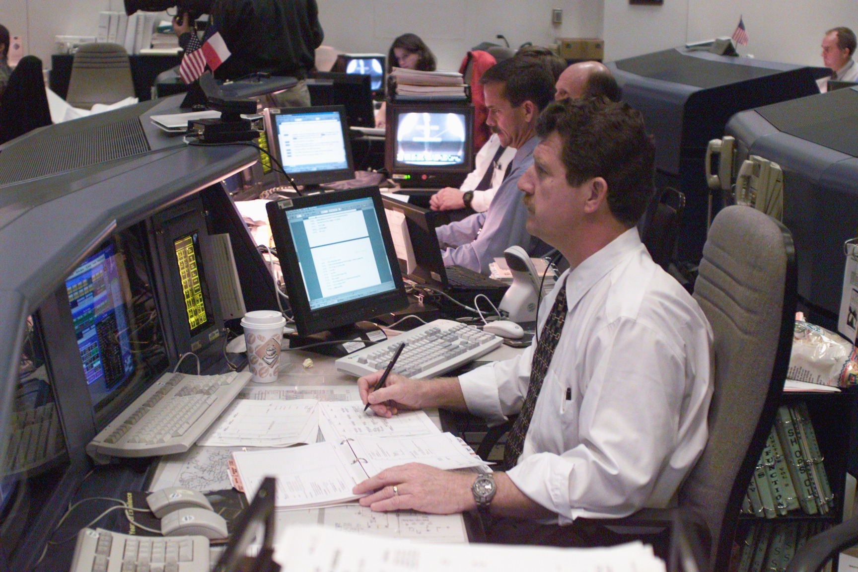 JSC2000-E-22726 (10 Sept. 2000) --- From his console in Houston's Mission Control Center (MCC), lead Flight Director Phil Engelauf intently watches a monitor during the rendezvous operations between the Space Shuttle Atlantis and the International Space Station in Earth orbit. Partially visible in the background are astronauts Gerhard P.J. Thiele and Chris A. Hadfield, at the Spacecraft Communicator (CAPCOM) console.