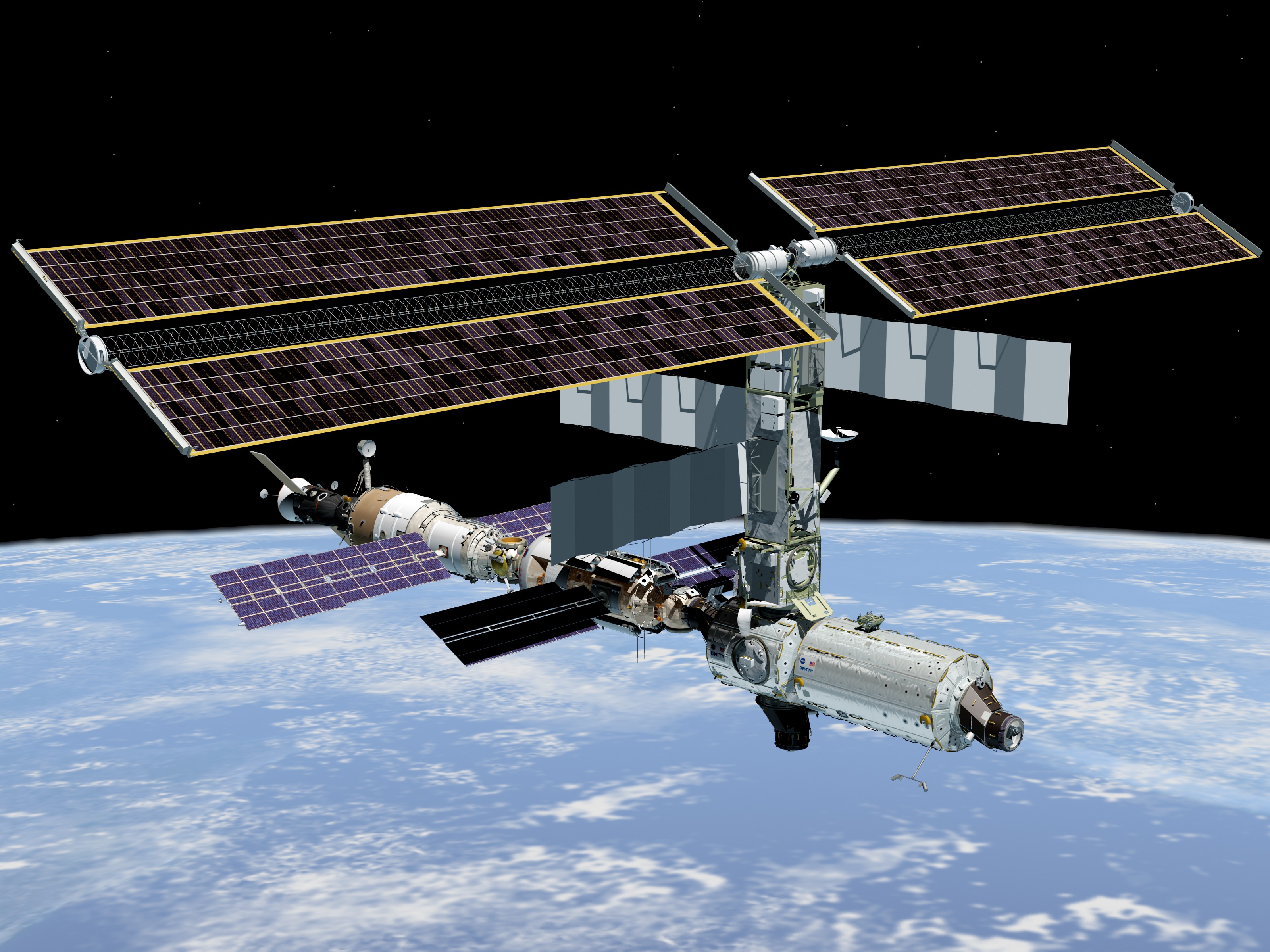 JSC2001-E-00360 (January 2001) --- Artist's rendering of the International Space Station (ISS) following the undocking of the Space Shuttle Atlantis, representing the completion of 5A. Note new position of U.S. Laboratory Destiny.