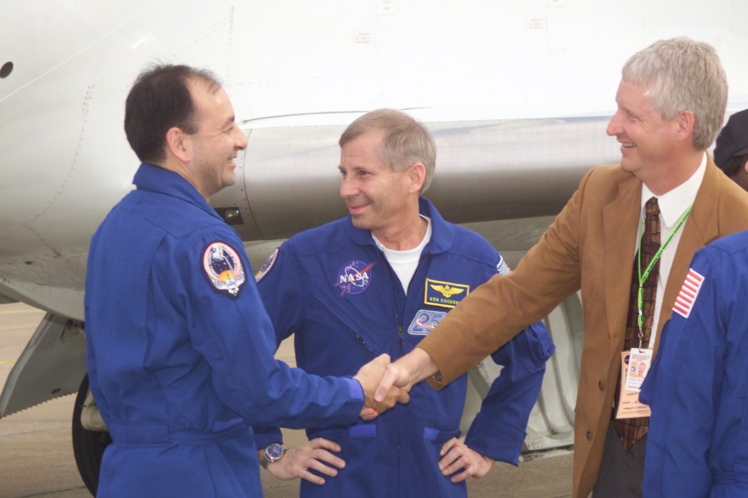 JSC2001-E-04804 (21 February 2001) --- Astronauts Mark L. Polansky (left) and Kenneth D. Cockrell (center), pilot and commander, respectively, for the STS-98 mission, are greeted by Steven A. Hawley of the Flight Crew Operations Directorate upon their return to Houston. The greetings took place prior to a welcoming ceremony at Ellington Field.